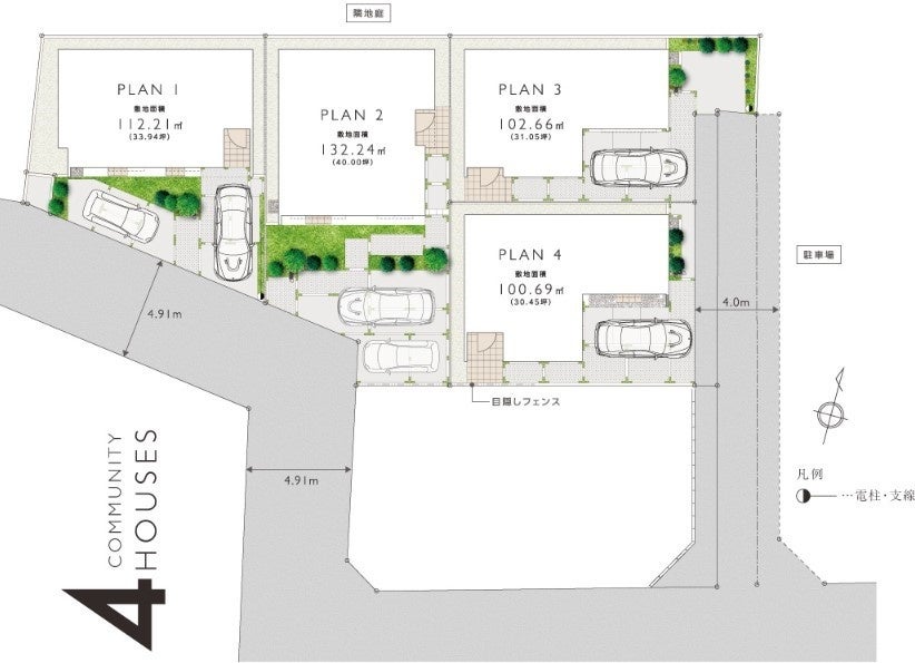 全邸の南側にカースペースや庭を配し、街並みを陽光が照らし、室内空間の採光性を高めています。また、随所に施した植栽が彩りのある風景を描いています。