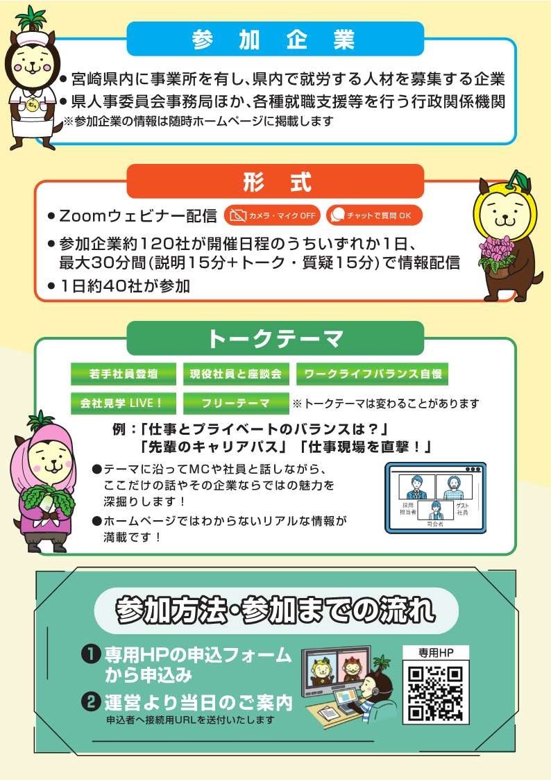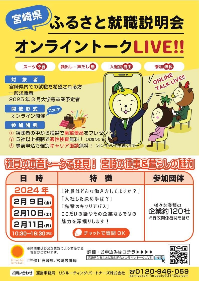 宮崎県外に進学している大学生やUIJターン就職・転職を希望する一般の方等を対象として、宮崎県内企業約120社によるオンライン企業説明会「宮崎県ふるさと就職説明会オンライントークLIVE!!」を開催します。(注意)要事前申込み(当日申込も可能)