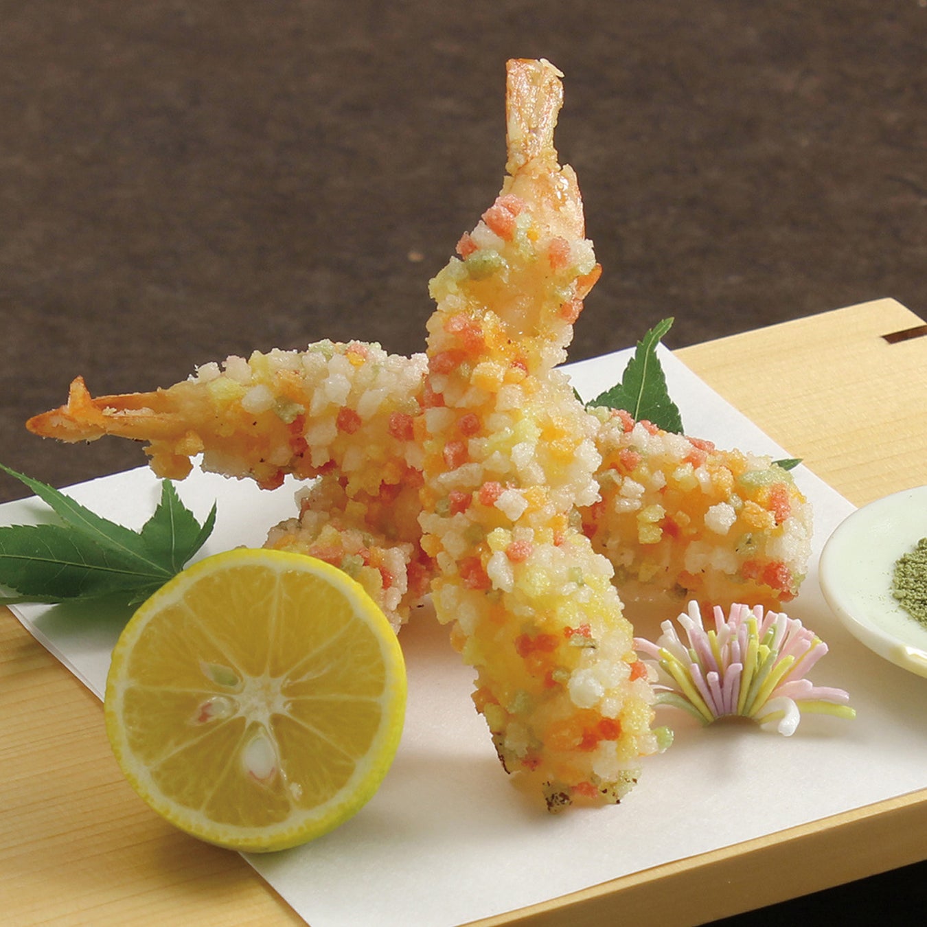 カラフルな五色あられをまとったエビは、冷凍のまま揚げるだけで手軽に調理できます。殻むきや衣付けといった面倒な下ごしらえは一切不要です。盛り付けるだけで料理に華やかさが加わり、懐石の前菜や揚げ物、松花堂弁当の一品としてはもちろん、串を刺せばワンハンドフードとしても活躍します。