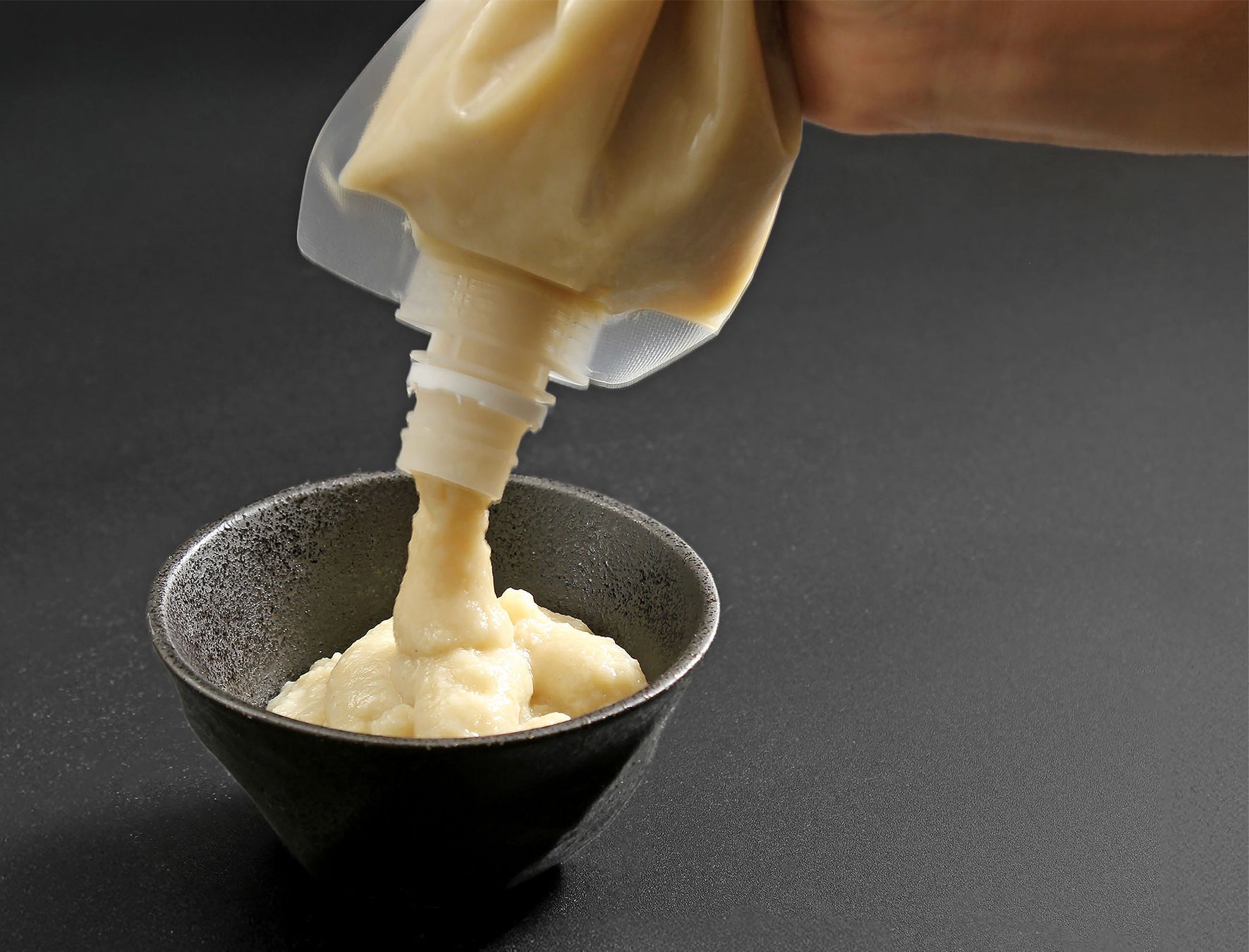 キャップ付きのパウチ容器入りで、誰でも簡単に器に絞り出してご使用いただけます。