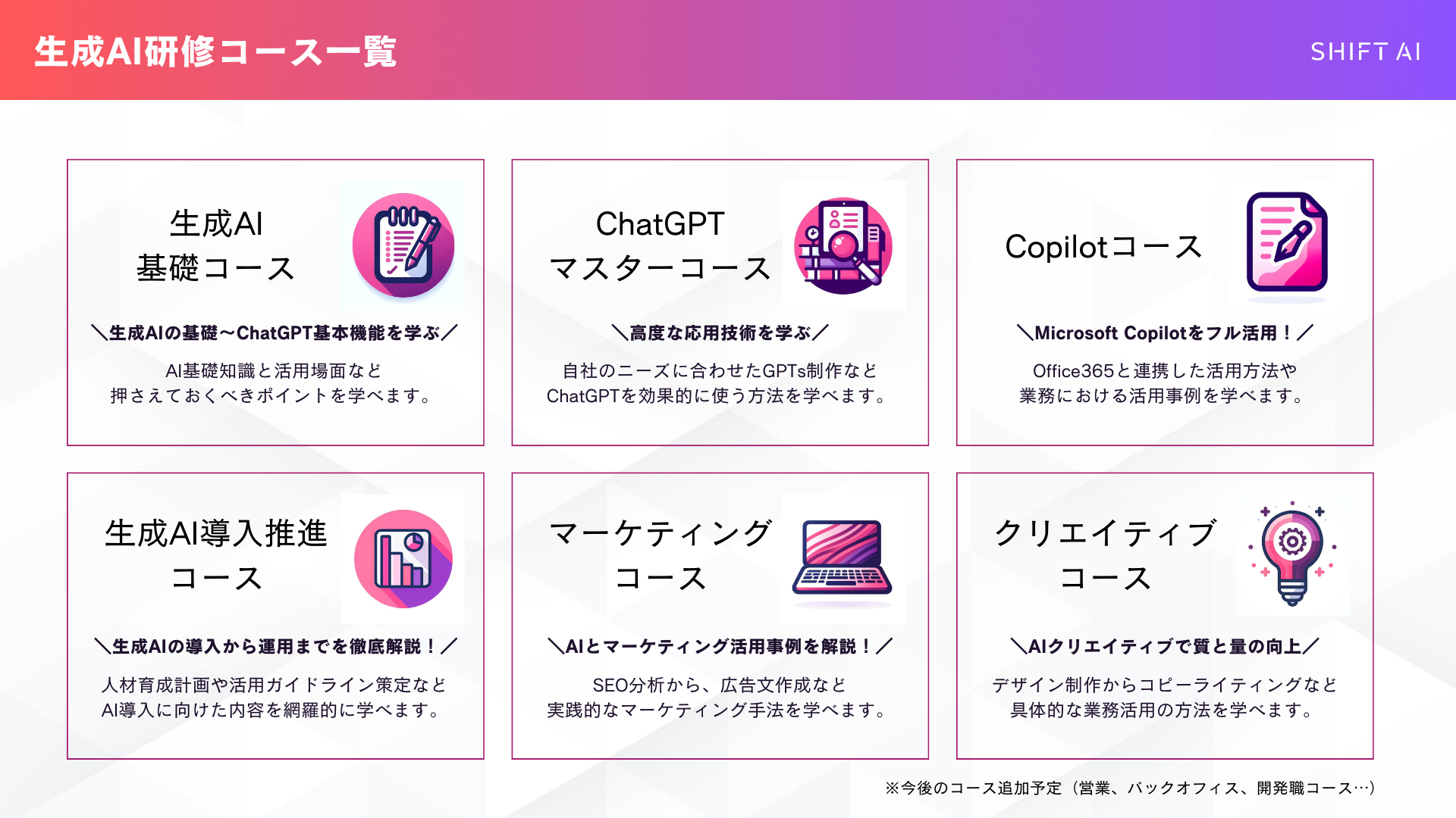 上記のような課題を持つ企業様に対して、SHIFT AIの法人向けAI人材育成サービスはこれらの課題を解決するための最適な育成プログラムをご提供いたします。