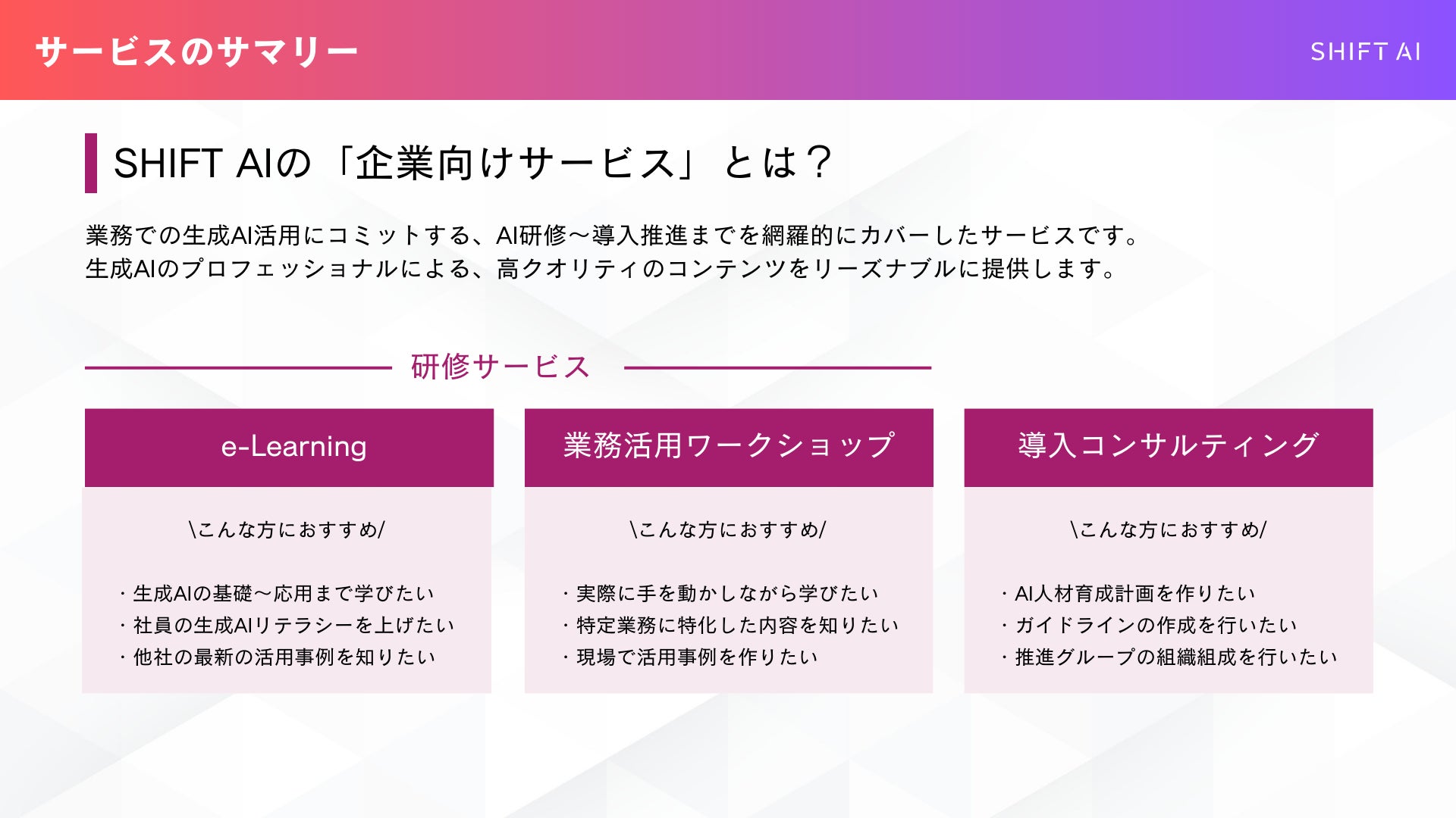 SHIFT AIの法人向けAI人材育成サービス概要