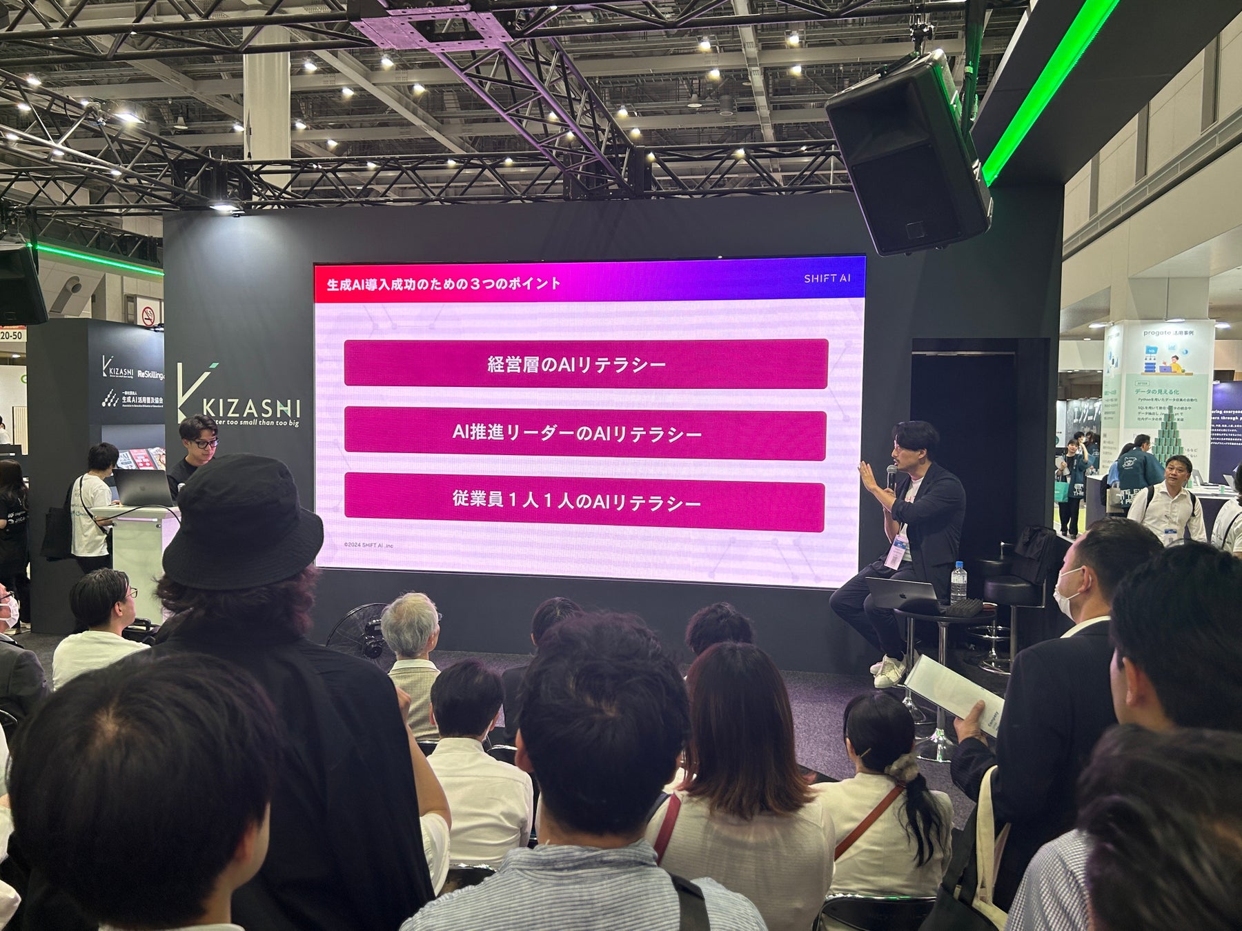 また、AI Tableブースにて、代表木内が「【完全版】2024年に必要な生成AI人材」をテーマに「企業にAIが必要か?」「なぜAI導入が進まないのか?」「生成AI活用のための3つのポイント」「AI導入ロードマップ」について事例を交えながらお話させていただきました。