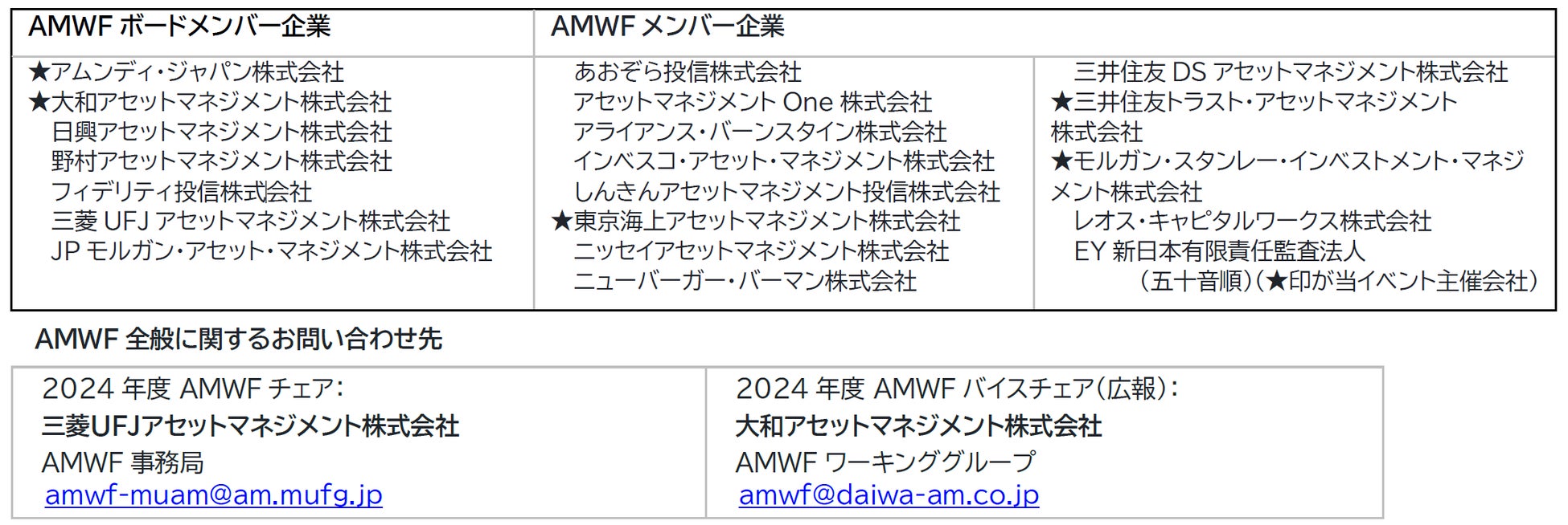 当イベントを主催したワーキンググループのリーダーである東京海上アセットマネジメント株式会社 人事総務部の須貝課長代理は、「本イベントがキャリア形成のご参考及びネットワーク構築につながったのであれば嬉しく思います。また、このたびAMWFはこれまでの取り組みが評価され、「Forbes JAPAN WOMEN AWARD 2024」で企業特別賞を受賞いたしました。今回の受賞を励みに、今後も業界全体で女性が活躍できる環境構築に向けて活動してまいります。」とコメントしております。