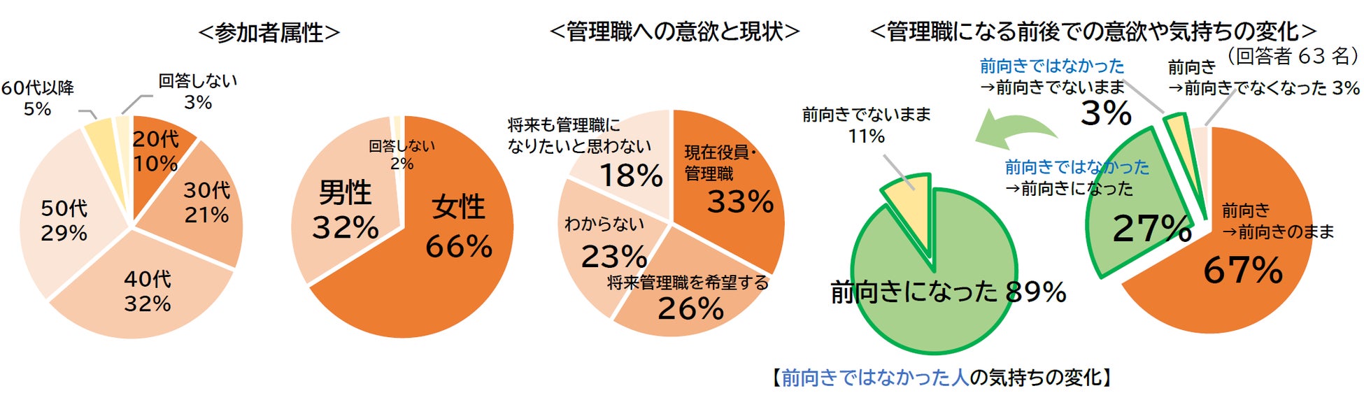 パネリストとして業界の第一線で活躍する女性リーダーたちが登壇し、「臆せずチャレンジすることが大事」「他の方と比べない、一歩でも半歩でもいいから進む。」など、自身のキャリア形成や転換期での前向きな姿勢を伺うことができました。参加者からは「ロールモデルではなく『ロールパーツ』という考え方を初めて知り、重要な考え方だと思った。」「キャリアを積んでいる人はみな、チャレンジしたからこその結果だと分かった。」といった声をいただくなど、大盛況のうちに終わりました。今回の参加者は男性が3割を超えており、年齢層も幅広く、業界全体における女性活躍推進への関心の高さを再認識しました。(下記の参加者アンケート参照)