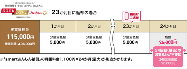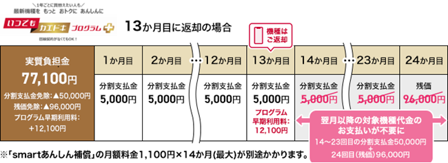 ご利用機種のご返却(※2)および早期利用料(※3)をお支払いいただくことで、13回目から23回目までの分割支払金および24回目に設定された残価額のお支払いが不要となります。