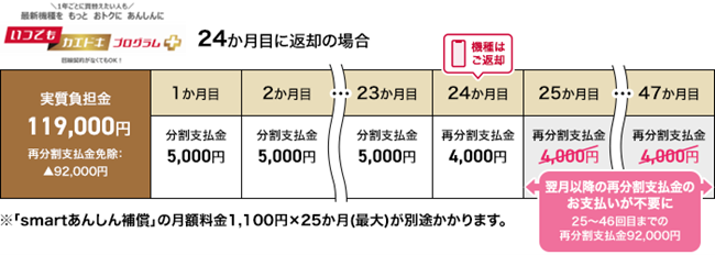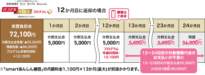 ※2 12か月目までに対象機種をご返却いただく場合においても、13回目から23回目までの分割支払金および24回目に設定された残価額のお支払いが不要となります。なお、12回目までの分割支払金についてはお支払いが必要となります。また、23~47か月目以降に対象機種をご返却いただく場合、翌月以降の残価額または再分割支払金のお支払いが不要となります。