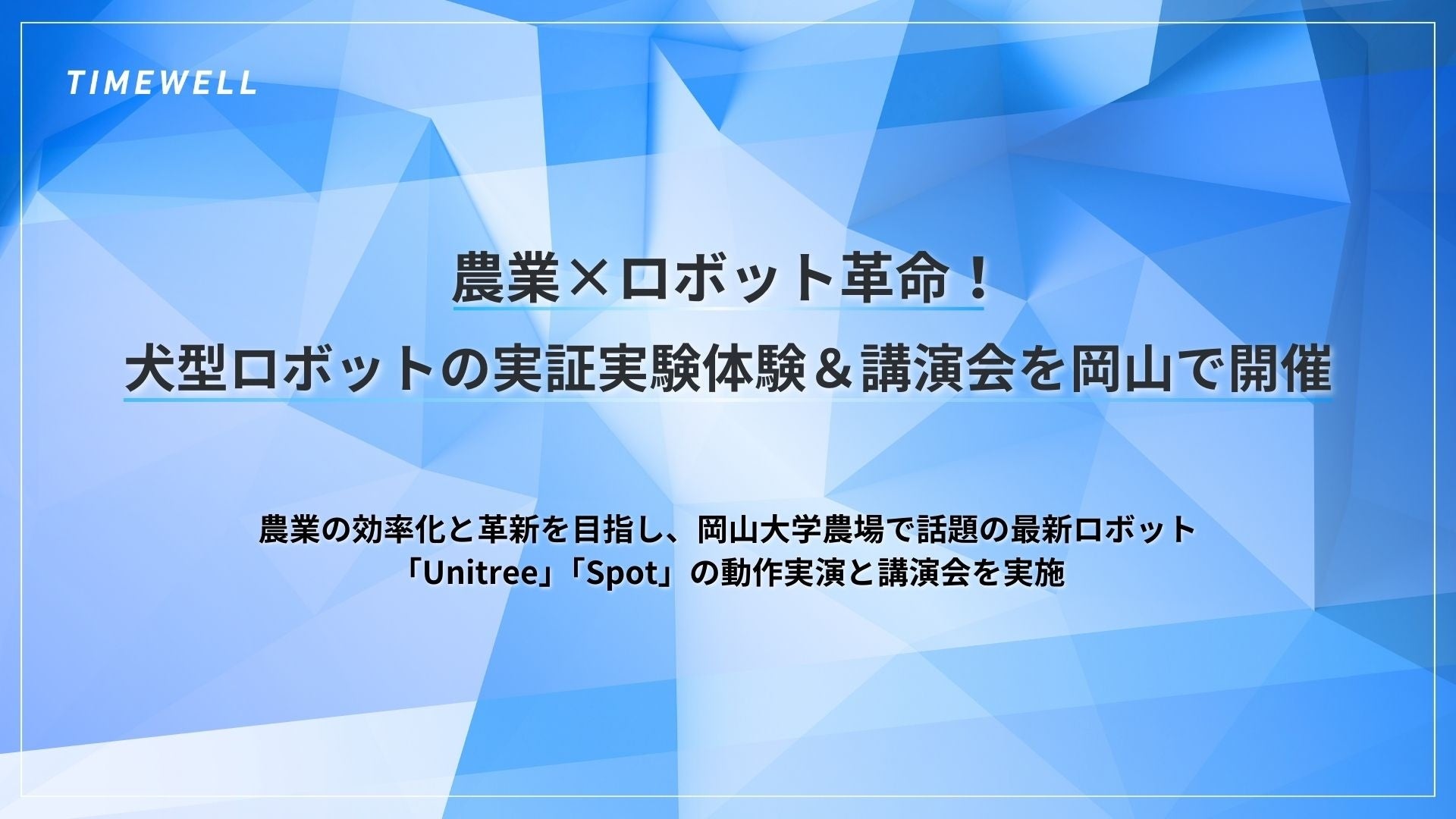 株式会社TIMEWELL(本社:神奈川県横浜市、代表取締役:濱本隆太、以下TIMEWELL)は、国立大学法人岡山大学(本部:岡山市北区、学長:那須保友)とともに、「犬型ロボット×農業最前線~未来の農業を体感する講演会&体験会~」を開催することをお知らせします。