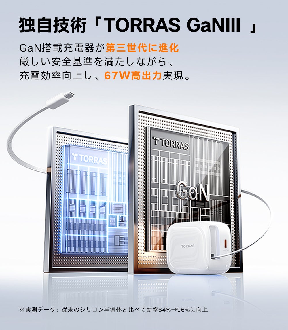 ※2:「TORRAS GANIII」とは、半導体素材「GaN(窒化ガリウム)」を採用し、従来のシリコン半導体と比べ高い充電効率と、高出力でも発熱が少ないという安全性を実現した、TORRAS独自開発の急速充電技術です。また、超伝導フィン(物理的な放熱構造)により、充電時の温度を下げることで、スマホのバッテリー寿命を延ばしています。