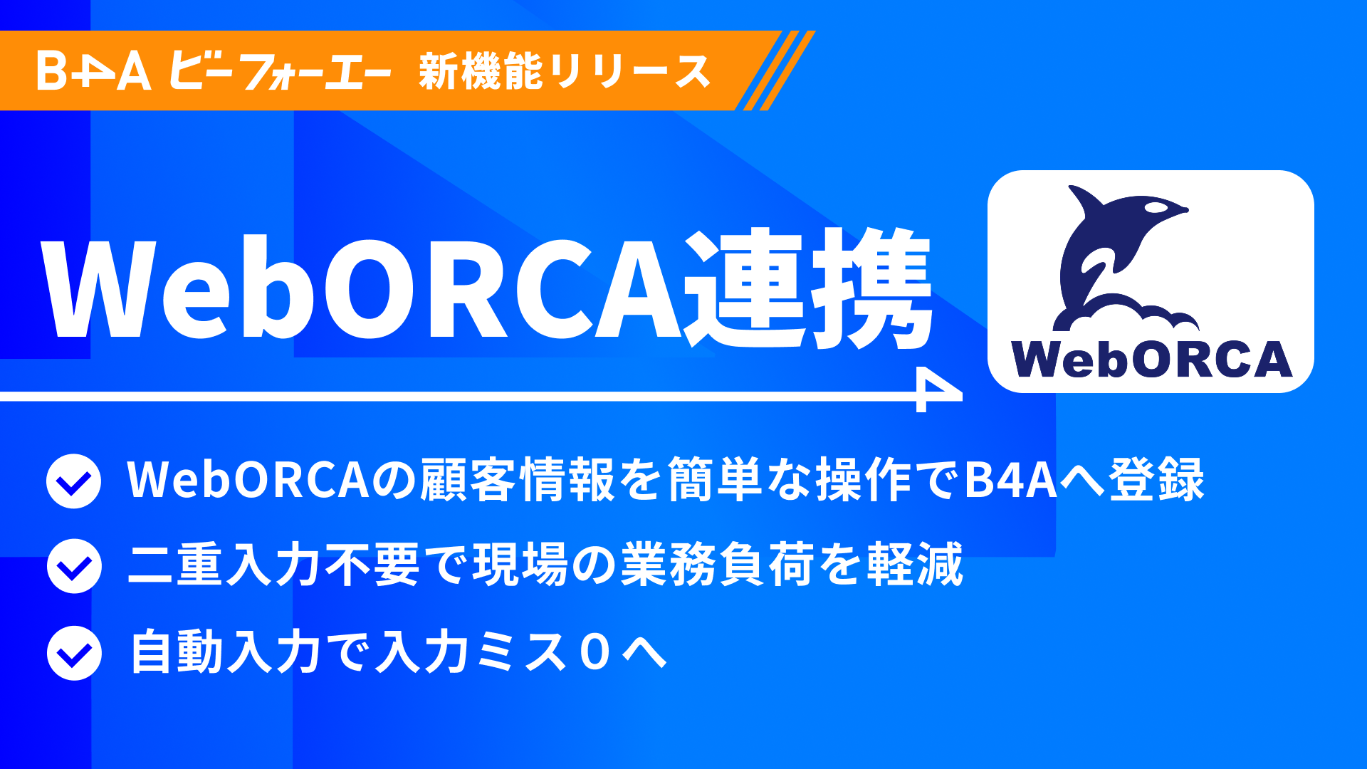株式会社B4A(代表取締役CEO:植松 正太郎)が開発・提供する、自由診療クリニック特化型のDXツール『B4A(ビーフォーエー)』は、日本医師会ORCA管理機構が提供するクラウド型日医標準レセプトソフト「WebORCA」との連携機能をリリースしました。