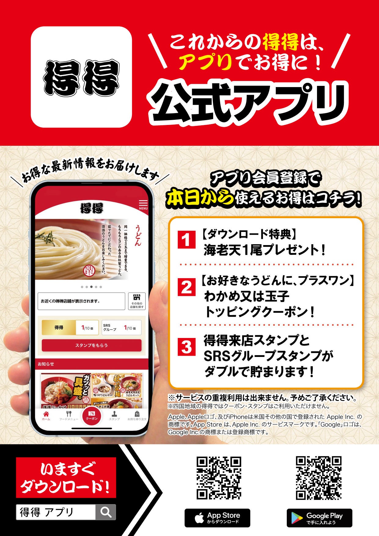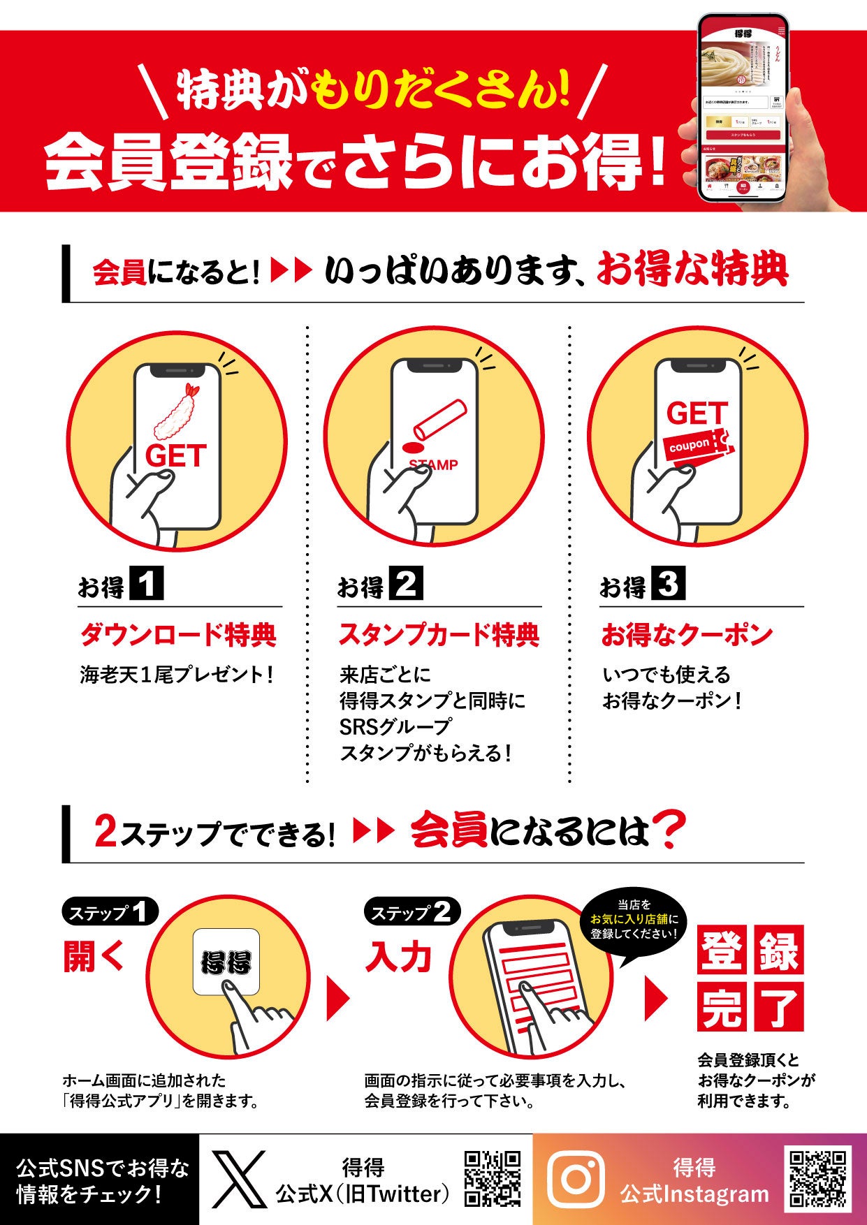 得得公式アプリをダウンロード&会員登録すると、その日から使える「海老天1尾サービスクーポン」がもらえます。