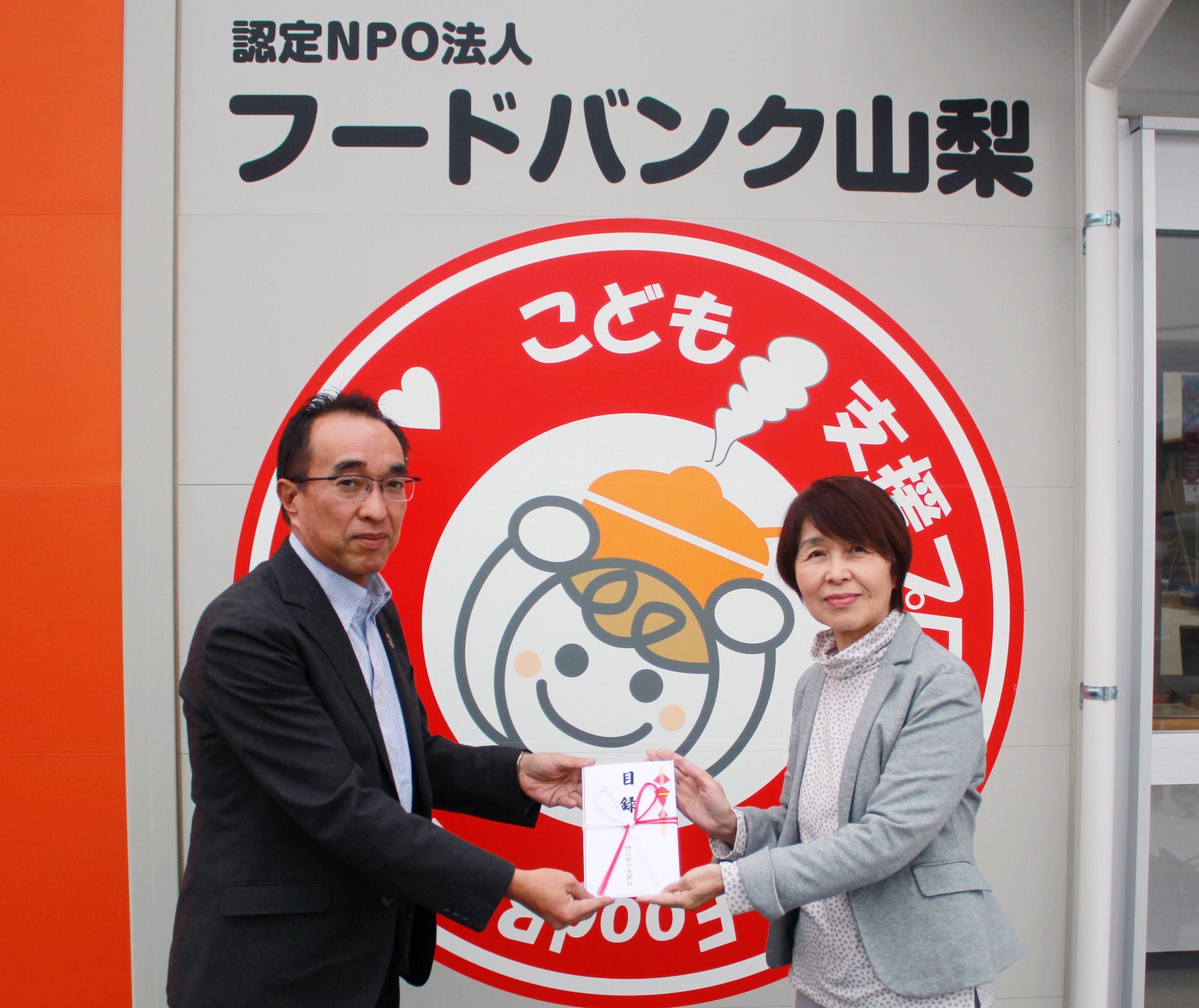 左から、雨宮総務部長、フードバンク山梨 米山理事長