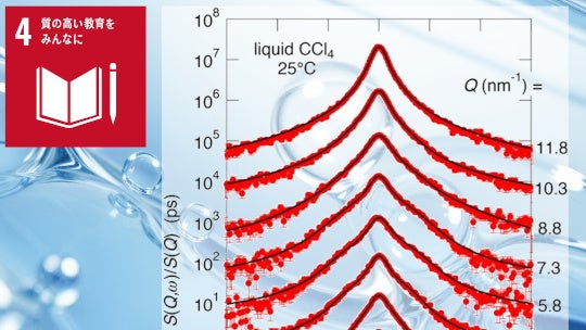 熊本大学産業ナノマテリアル研究所の細川伸也特任教授は、福岡大学理学部の吉田亨次准教授と協力して、簡単な分子からなる四塩化炭素(CCl4)の液体を対象として行ったX線非弾性散乱(IXS)(注1)に見られる非常に「速い音速(注2)」の起源を明らかにしました。CCl4液体では、IXSで得られる音速は超音波で得られる一般的な音速と比較しておよそ57%も異常に速くなっています。この研究では、IXSで得られたデータの詳細な解析を行い、音速の異常な速さは分子内部の振動運動と分子の回転運動によってエネルギーが失われることによることがわかりました。これは、分子の振動方程式に含まれる減衰項に含まれる記憶関数の2つの粘弾性の緩和時間について、速い方は分子内部の振動の、遅い方は分子全体の回転運動の緩和時間とほぼ一致していることで示されています。この結果はCCl4液体に限らず、液体アセトンや液体ベンゼンなどの分子の作る液体(分子性液体)に一般的に見られる「速い音速」の起源は同じであることも、別のIXS研究から明らかになりました。この研究は、放射光X線や中性子を用いた、一見難しそうに思われる実験結果が、大学学部1年次程度の力学で学ぶ基礎的な減衰振動(注3)の考えで解き表すことができることを示しています。今回の研究では、これまでブラック・ボックスになっていたIXSスペクトルが示す分子性液体の速い音速の謎を、データ解析を慎重に行うことで、分子の振動運動や回転運動と結びつけることができた画期的な業績と言えます。