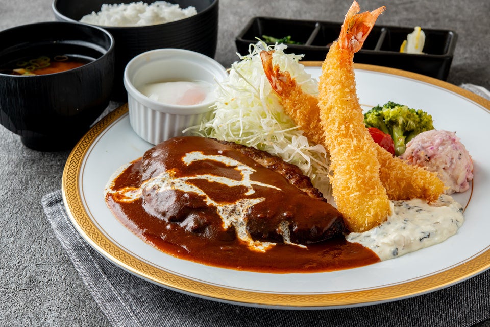 中でも注目は、料理長渾身の180gの手ごねハンバーグに大きなエビフライ2本を添えた、平日・一日限定5食の「ハンバーグ&エビフライランチ」。また、塩とわさびで味わう京都名物「牛カツ」も、お得に楽しめます。