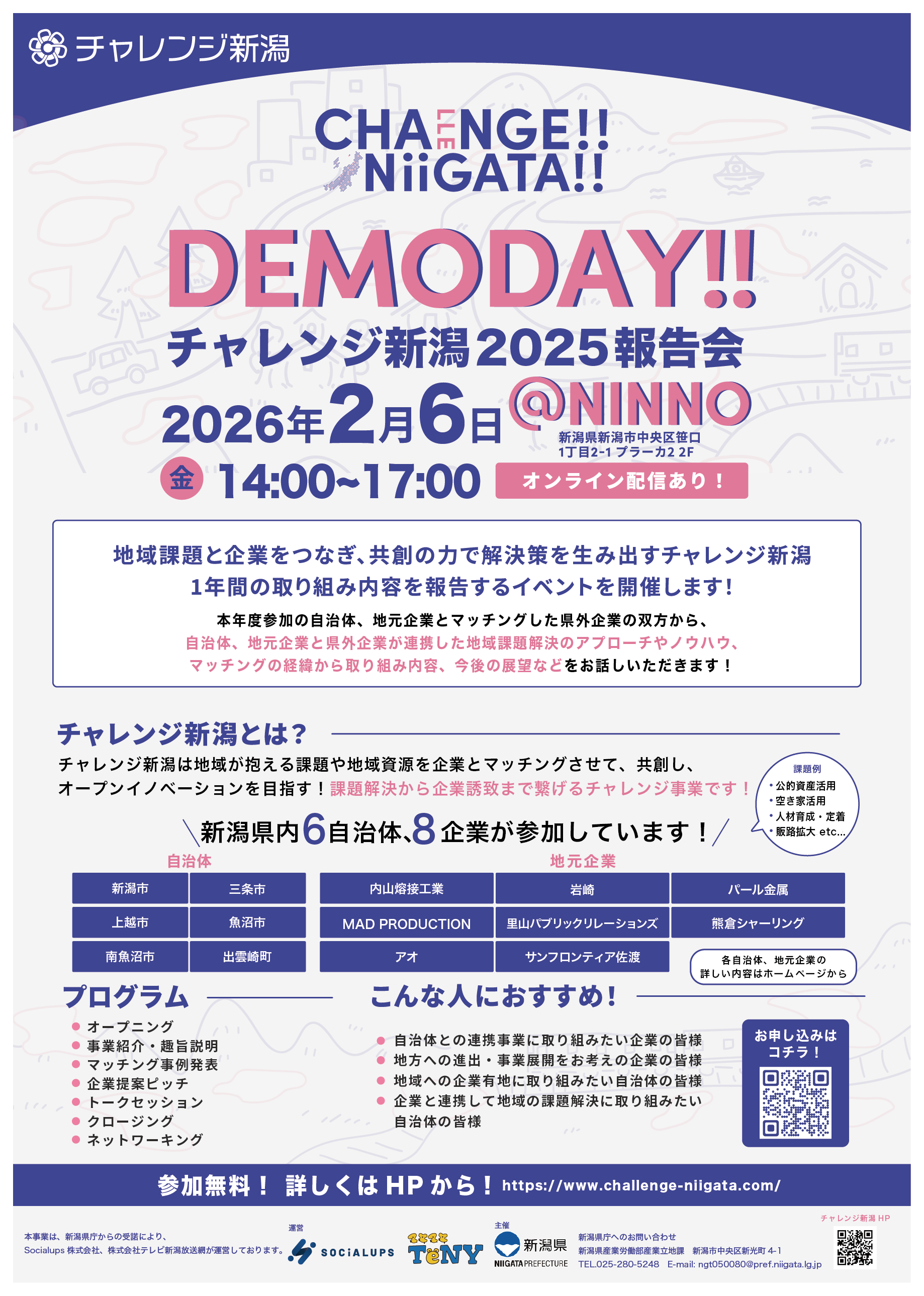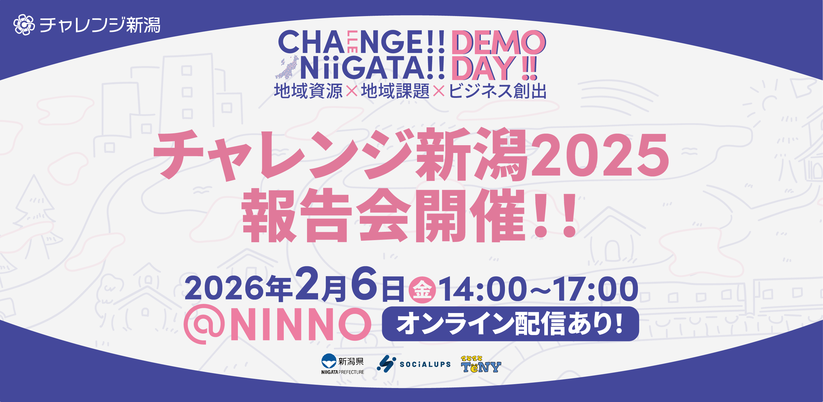 Socialups株式会社(本社:新潟県新潟市中央区、代表取締役社長:髙瀬 章充)は、新潟県主催の地域と企業をつなぎ共創する「チャレンジ新潟」の2025年度報告会を開催します。