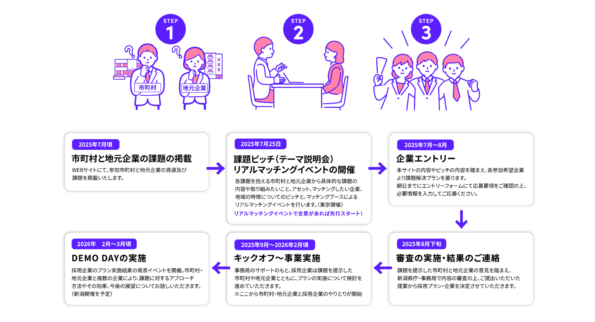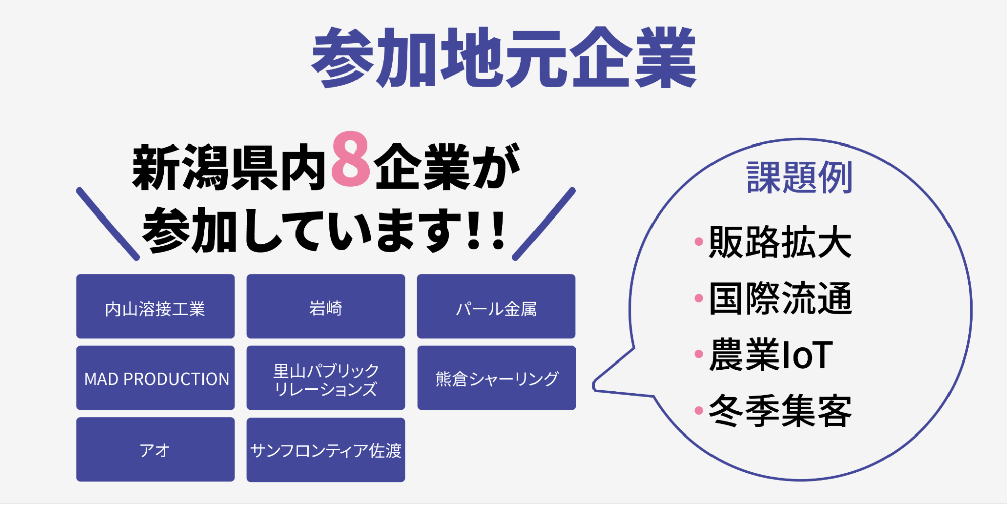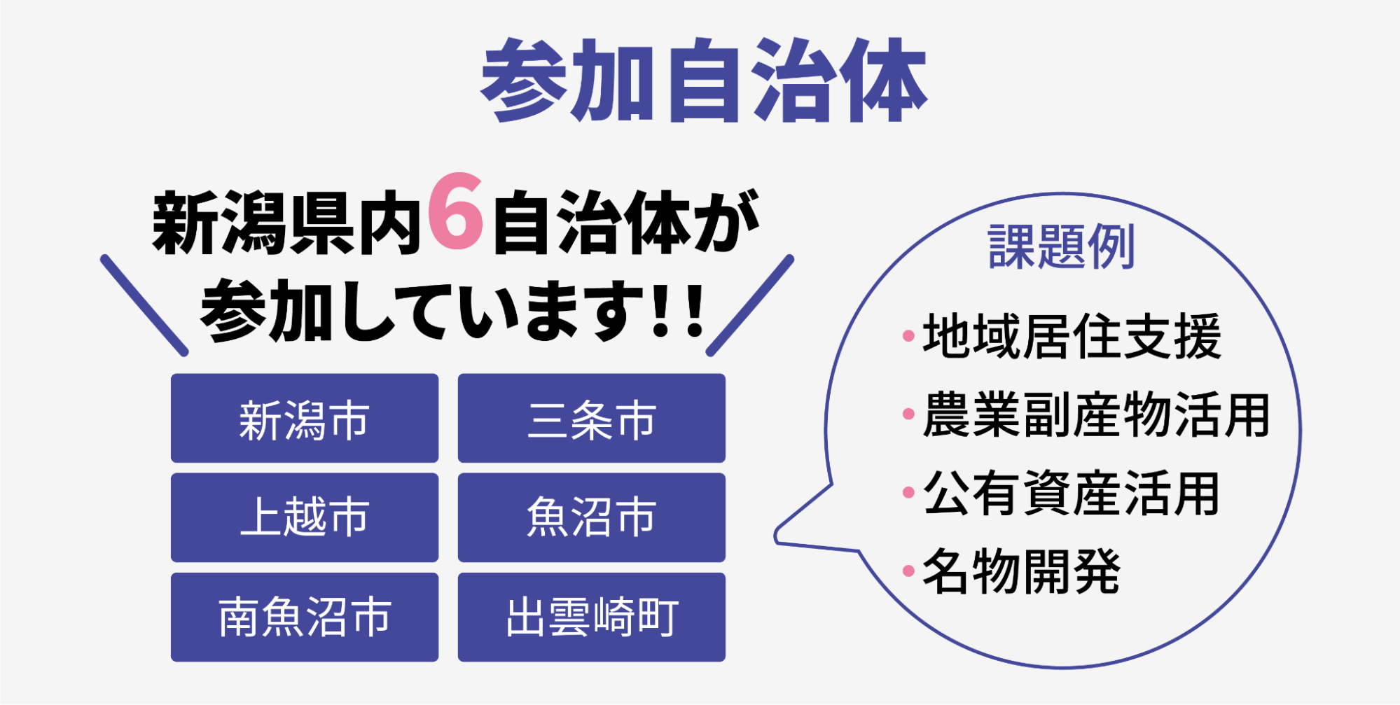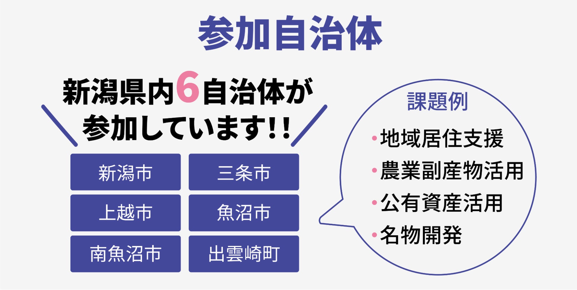 今年度は新潟県内6自治体、8企業が参加し、昨年7月に開催した課題テーマピッチによる企業とのマッチングイベントから始まり、企業エントリーによるマッチングを経て、マッチング後のプロジェクトをサポートしてきました。