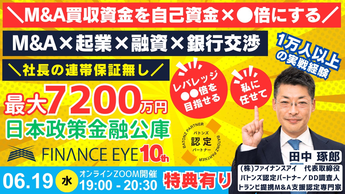 株式会社ファイナンスアイ(所在地:大阪市、代表:田中琢郎)は、M&Aの買手向けに買収資金を増やしたいM&A起業やM&A買収を考える起業家・個人事業主・中小企業の経営者に向けて特別なセミナーを開催致します。『M&A×融資で買手の買収資金を自己資金×●●倍にする!M&A×起業×融資×銀行交渉の今スグ使える実戦ノウハウ。社長の連帯保証無し!無担保で最大7200万円!日本政策金融公庫の新規開業資金(創業融資)を活用する。』(※参加者の顔出しナシ)と題したこのセミナーでは、日本国内M&A成約数1位のBATONZ(バトンズ)認定パートナーの田中琢郎社長自らが、1万人以上の起業家や経営者を支援した実戦経験をもとに、M&A起業やM&A買収資金にも使える、新規開業資金(創業融資)を成功させるポイント、M&Aを成功させるための案件選定基準を分かりやすくお伝えします。本セミナーは、2024年6月19日(水)19:00より、オンラインでZOOMを使用して実施されます。コロナ禍を乗り越え、億超えの起業家を生み出し続けたファイナンスアイが、良い案件も悪い案件も1万人以上をリアルに支援したから分かる融資審査の本音と建前、M&Aのオカネとリスクの解決策を分かりやすく伝えます。セミナーでは田中社長とライブで質疑応答ができるので厳格化する融資審査を乗り越えるために具体的なアドバイスが欲しい人はチャンスです。セミナー申込時の受付フォームで事前質問に記入してもらえれば、セミナー中に回答できそうにない内容でも別途具体的なアドバイスを受けられます。この機会に誰にも相談できなかった悩みや疑問を解決しましょう。このセミナーを受講すれば、あなたのビジネスもファイナンスの力を活用して成功の軌道に乗ることができるでしょう。会社の未来のオカネをクリエイティブする事がファイナンスです。