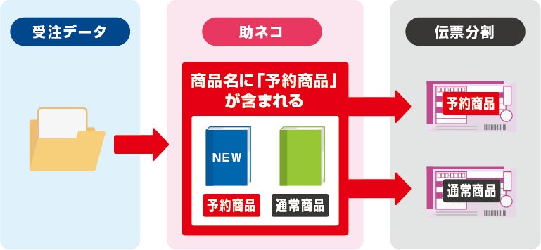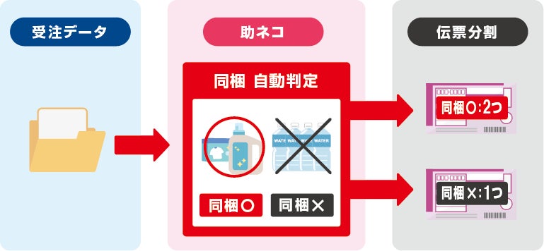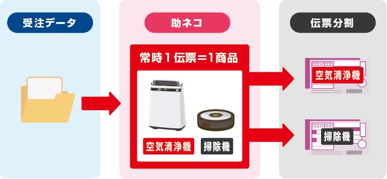 そこで助ネコでは、これらの課題を解決するために「伝票自動分割」機能を開発しました。受注データ内の購入商品を自動で判別し、条件に応じて伝票を分割するため、担当者の手作業を大幅に削減します。
