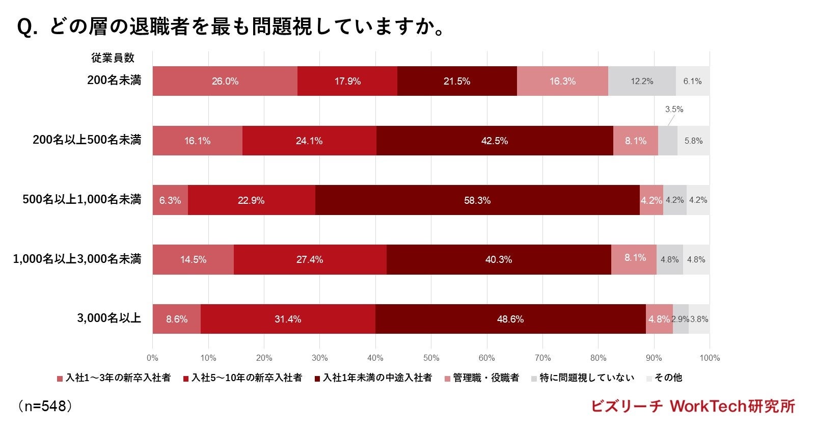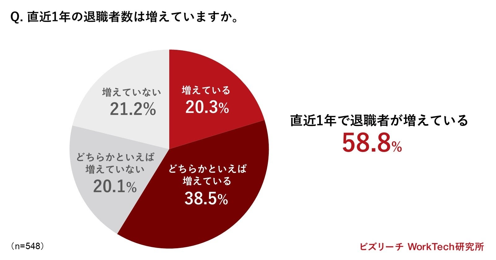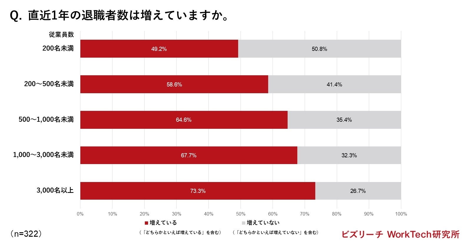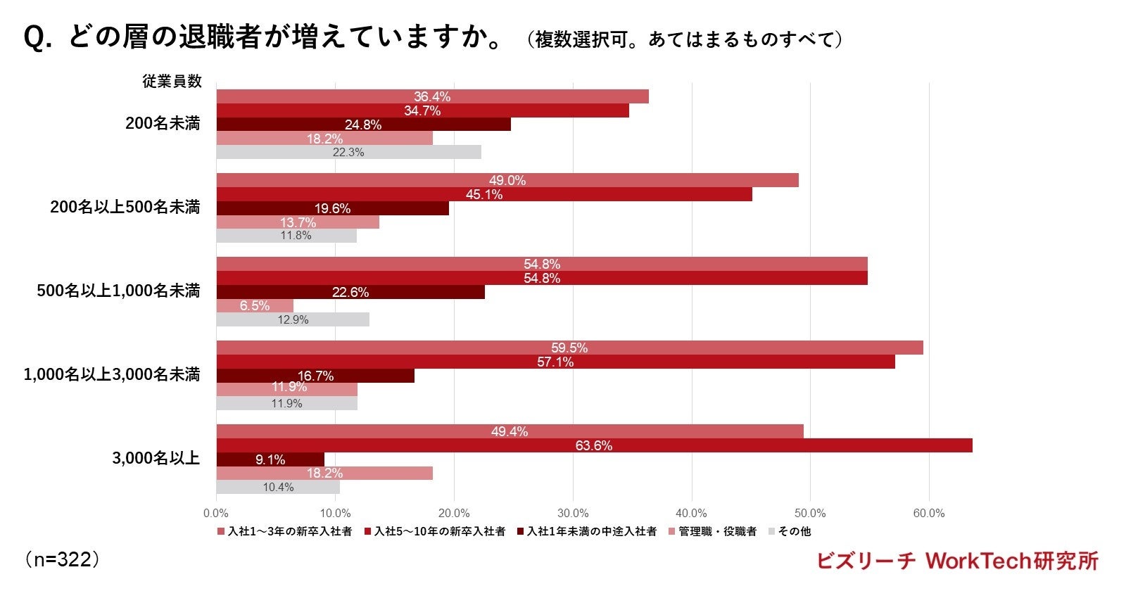 <ビズリーチ WorkTech研究所、退職者状況の調査結果を発表>直近1年で退職者増加の企業が約6割、大企業は7割超。最も問題視している退職者層は「新卒入社5~10年の中堅層」