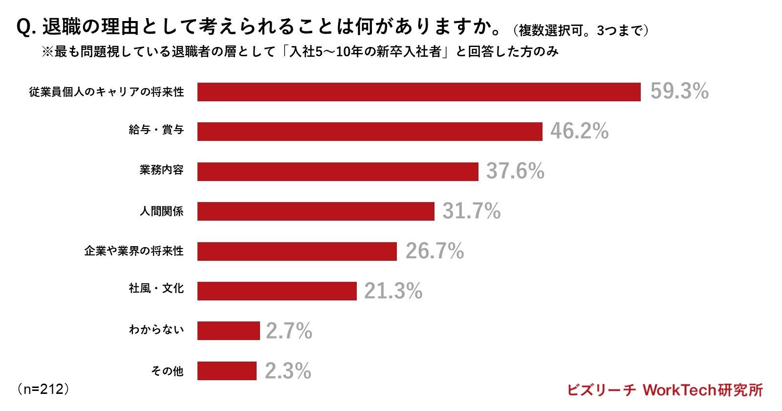 次に、最も問題視している退職者層をたずねたところ、従業員数200名以上の規模の企業において「入社5~10年の新卒入社者」が突出する結果となりました。また、退職の理由をたずねたところ、最も問題視している退職者層を「入社5~10年の新卒入社者」と回答した企業では、「従業員個人のキャリアの将来性(59.3%)」が最も多く、2位の「給与・賞与(46.2%)」に比べて10ポイント以上高い結果となりました。