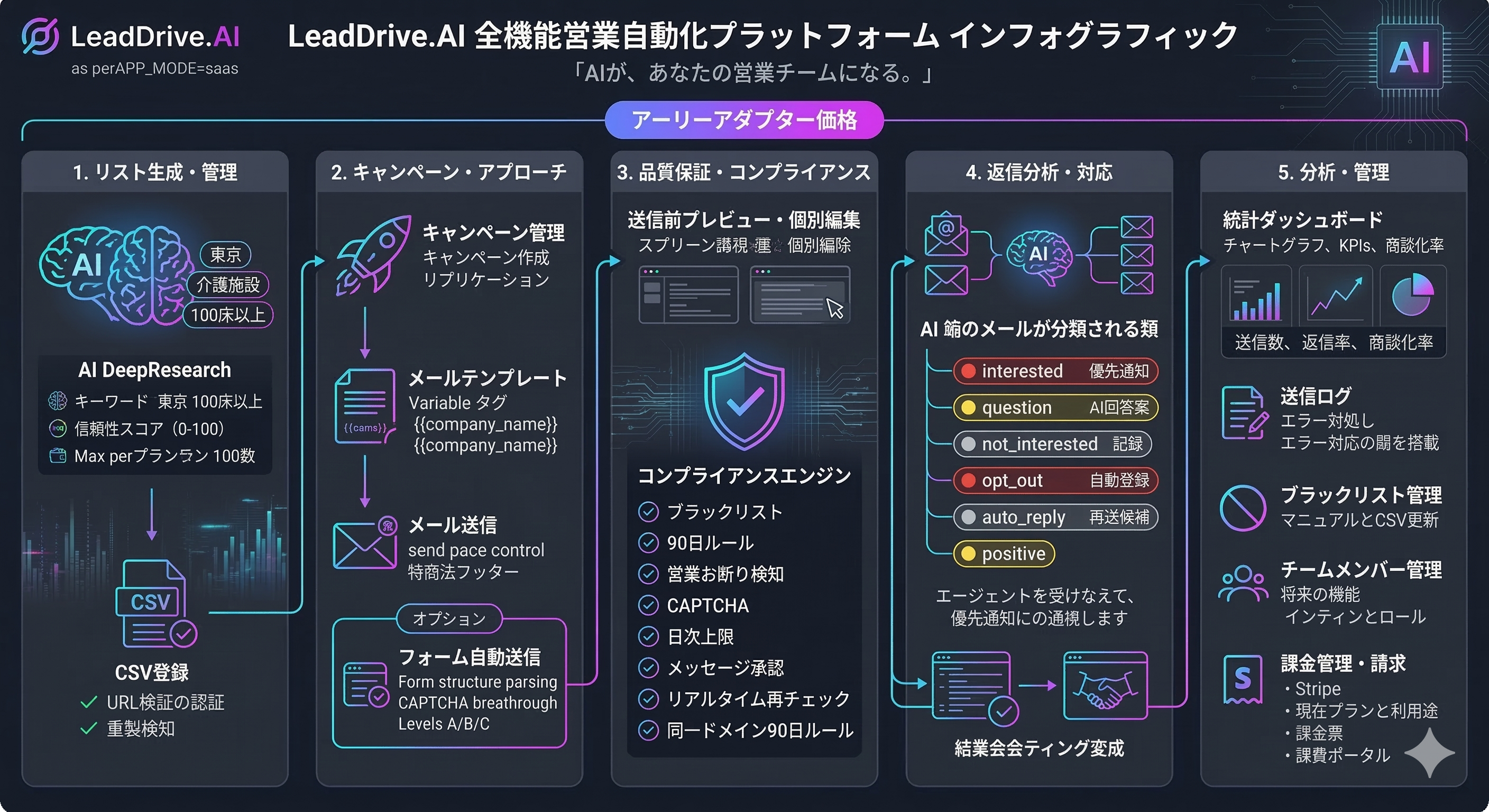 LeadDrive.AIは今後、SNS連携(Instagram DM・X連携等)によるマルチチャネル営業機能の追加、AIによる商談スクリプト自動生成、CRM連携機能の拡充など、営業プロセス全体のさらなるAI化を進めてまいります。