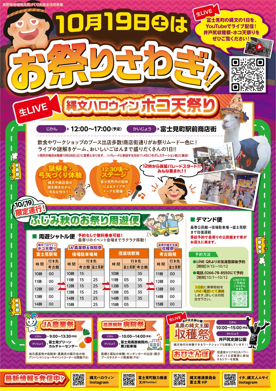 10月19日(土)はJA農業祭、富士見高原病院の病院祭、井戸尻史跡公園の高原の縄文王国収穫祭も同時開催されます。