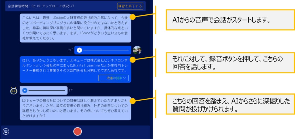 AIロープレは、実際の商談やカスタマーサービス、コールセンターの現場などを模擬して行います。学習者はAIチャットボットとの会話を通じて、対話スキルの向上を目指します。
