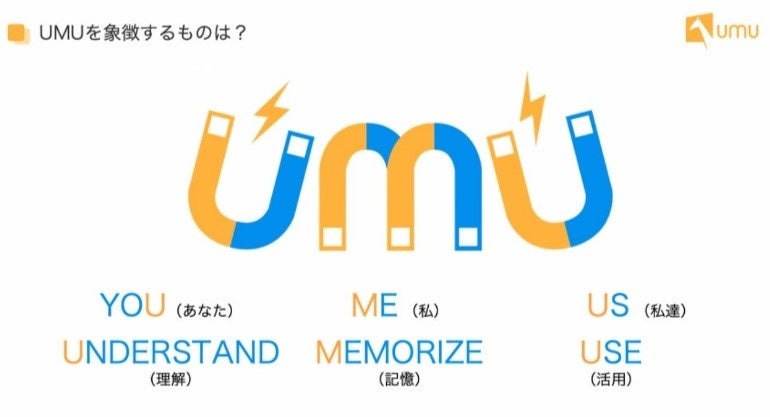 UMUという名称はyoU・Me・Us、「あなた、私、私たち、みんなで学び合う」という意味合いと、Understand・Memorise・Use、「知識を理解し、記憶に定着させ、仕事で活用できるまでサポートするプラットフォームである」という意味合いが込められています。AIなどの「テクノロジー」と、人はいかにして学ぶのかという「学習の科学」を組み合わせ、デジタル時代の学習を効果的なものにします。