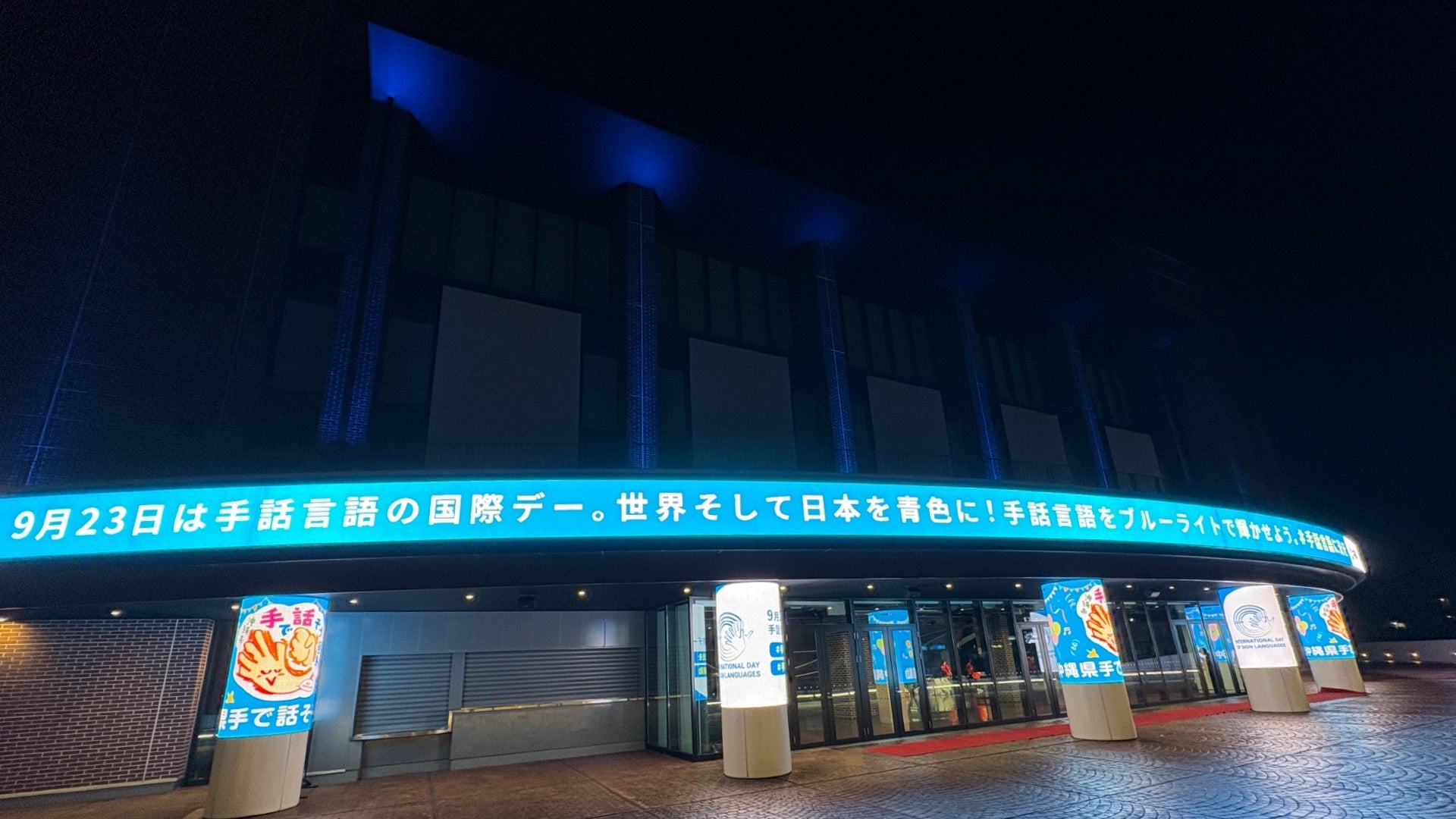 また、日没後には沖縄アリーナを青色にライトアップし、ウェルカムビジョンには「9月23日は手話言語の国際デー」のメッセージが映し出されました。