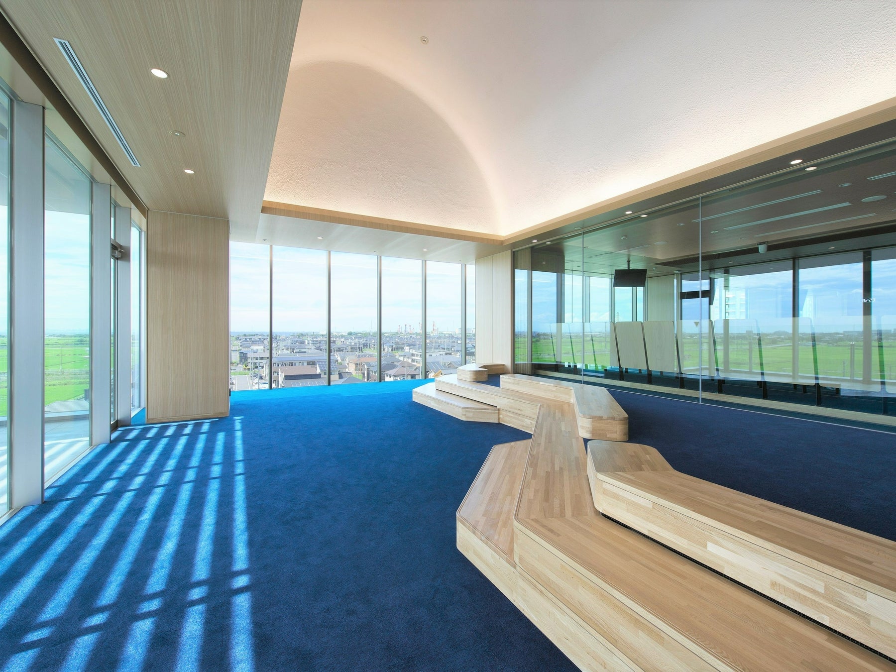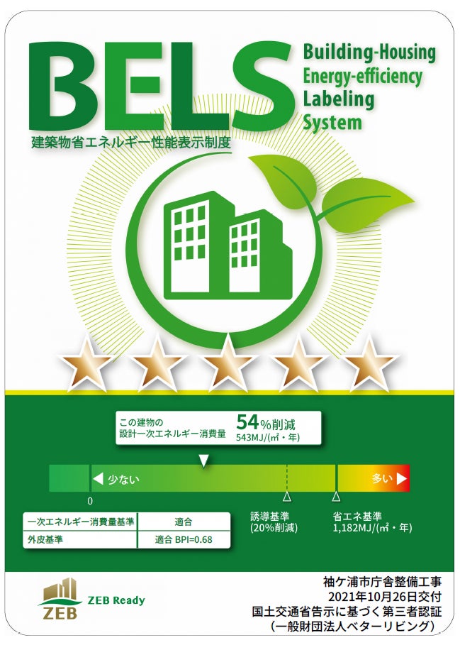 新庁舎は、建築物省エネルギー性能表示制度(BELS)による5段階評価の最高ランクを獲得すると同時に、新築工事と既存庁舎の改修を含めた庁舎建物として、千葉県で初めてとなる「ZEB Ready」認証を取得しました。