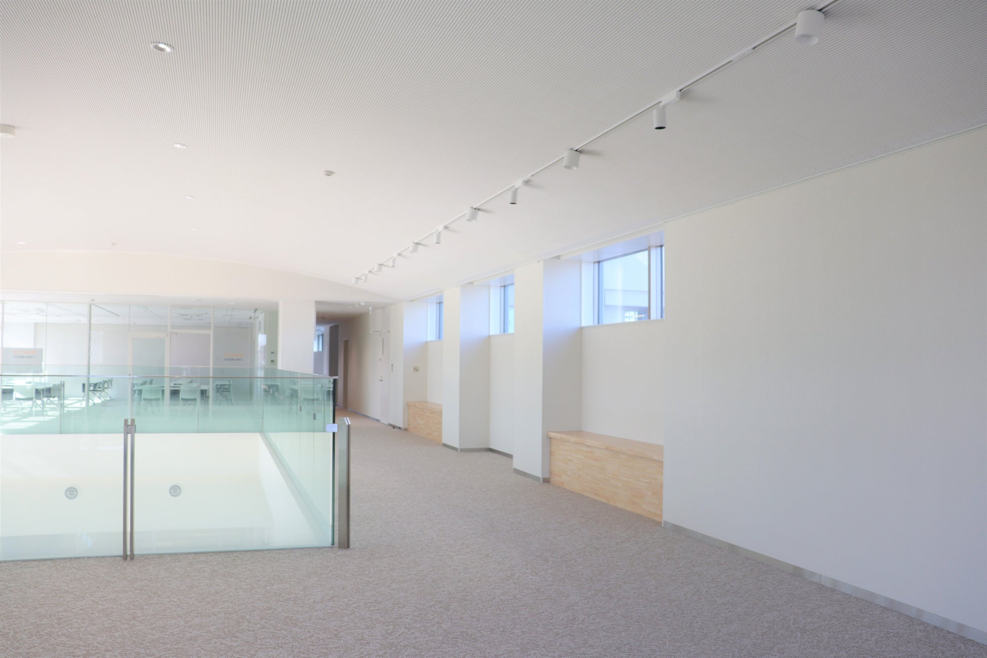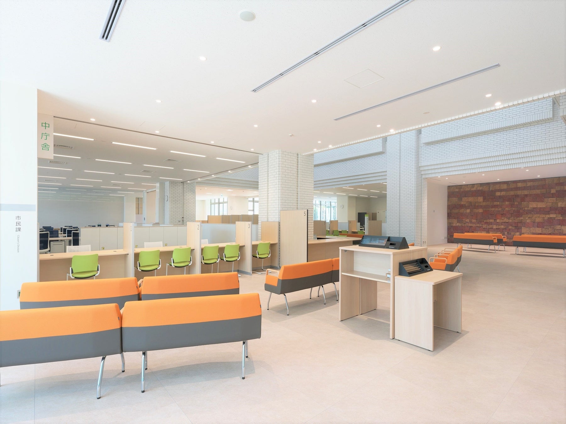 来庁者を迎える1階は視線の先に緑と自然光を取り込んだ、明るくシンプルな空間を構成しています。また、市民利用の多い部署の窓口を集約し明確なゾーン構成により、入り口から目的の課の窓口まで容易に誘導する配置としています。北庁舎はメンテナンス性を考慮し、各階に庇を設置しています。事務スペースは、OA フロア化により将来のレイアウト変更に対応しています。