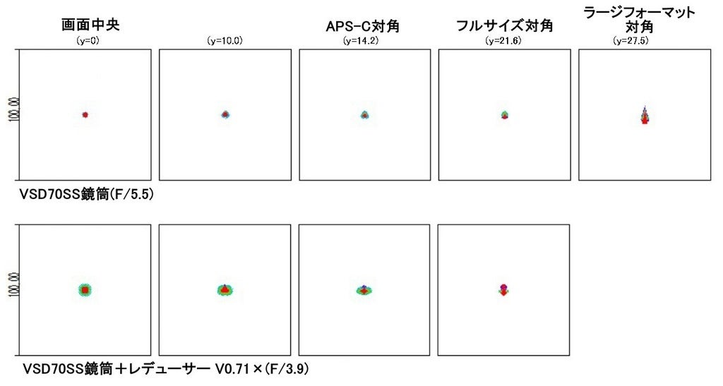 ユーザーのスキルに関わらず、満足できる撮影結果が安定して得られるよう、VSD70SSでは設定精度に対する「ピークのなだらかさ」にこだわりました。エアリーディスクに収まるピント範囲が広い設計を採用していますので、ピント合わせ精度やスケアリングのズレが多少残っていても写野周辺における星像の色味変化や崩れが起こりにくくなっています。これにより、写野全面に渡りシャープで美しく均一な星像が常に得られ、撮影後の画像処理も含めて安定した撮影結果が期待できます。