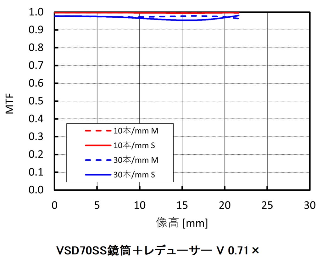 MTFとは「Modulation Transfer Function」の略で、レンズ性能の評価指標を空間周波数特性で表したものです。レンズの解像力や撮影対象の持つコントラストを像面でどれだけ再現できるかを表します。グラフは水平軸に画像中央からの距離、垂直軸にコントラスト値(最大1)を設定しています。10本/mmの曲線(赤)が1に近いほどコントラストが高く、30本/mmの曲線(青)が1に近いほど)解像力が高いことを示します。VSD70SSではコントラスト値がいずれもほぼ1に近い値を示しており、極めて優れた光学系であることが分かります。