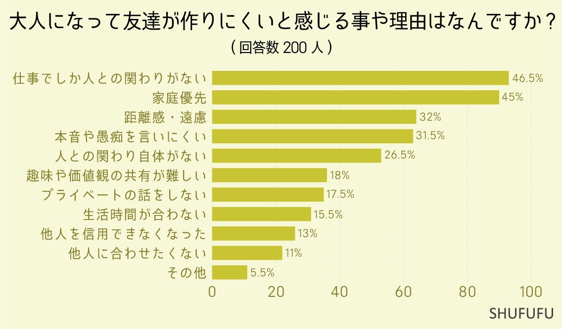 大人になって友達が作りにくいと感じる事や理由はなんですか?(複数選択可)に関しては1位「仕事でしか人との関わりがない(46.5%)」、2位「家庭優先(45%)」でした。大人になって仕事をするようになると学生時代のように自由な時間が少なくなり、友達関係を維持するのも難しくなりそうです。