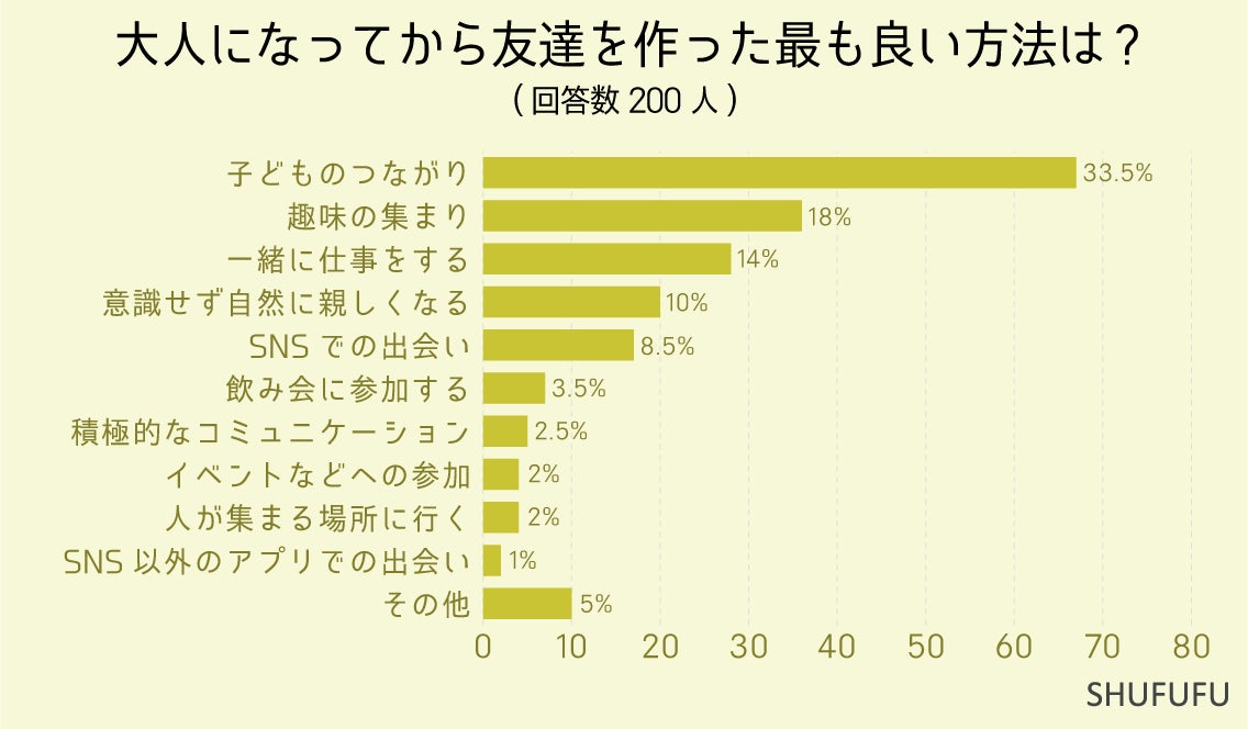 大人になってから友達を作った最も良い方法を尋ねたところ、1位は「子どものつながり(33.5%)」、2位「趣味の集まり(18%)」となりました。子どもや趣味など共通の目的がある集まりの中だと友達は作りやすそうですね。