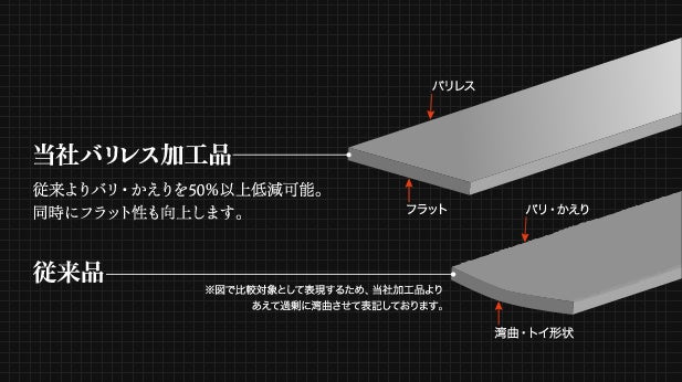 従来よりスリット加工の切れ味が良く、バリやカエリが少なく安全性の高かった自社加工品をさらに突き詰めて、わずかに残ったバリやカエリをも解消、フラット性を極限まで追求した新技術。