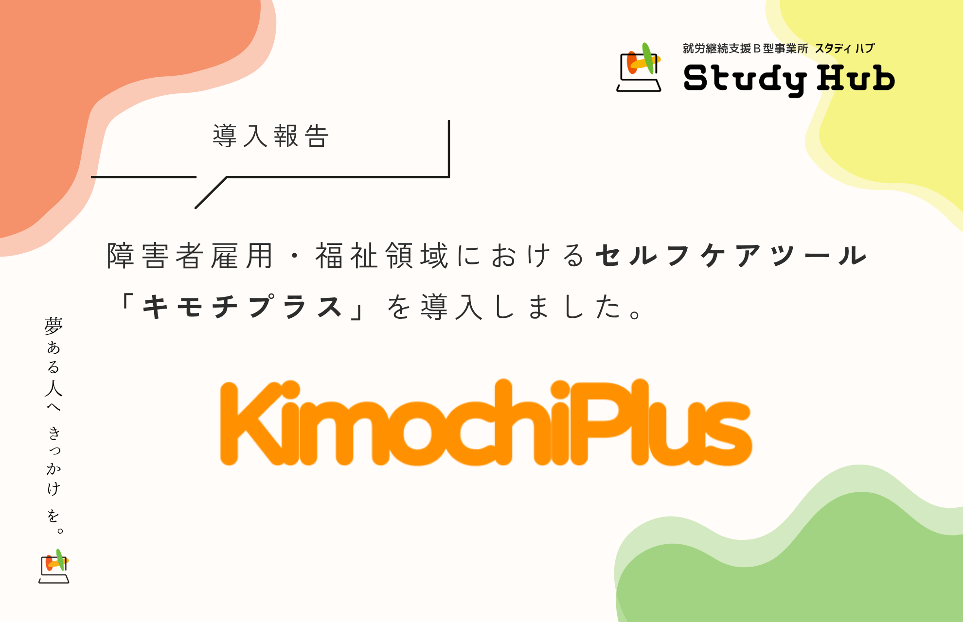 Study Hubは、「学びたい」「働きたい」「就職したい」という意欲あるすべての方へ、「夢ある人へ“きっかけ”を」という理念のもと、IT・PC業務に特化した支援を通じて、障害のある方々のキャリア形成を支援してまいります。