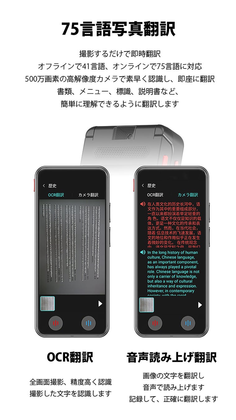 VORMORデュアルスクリーン翻訳機で、画像内のテキストの意味を解読。75言語のオンライン対応と41言語のオフライン対応で、写真翻訳もスムーズに行えます。