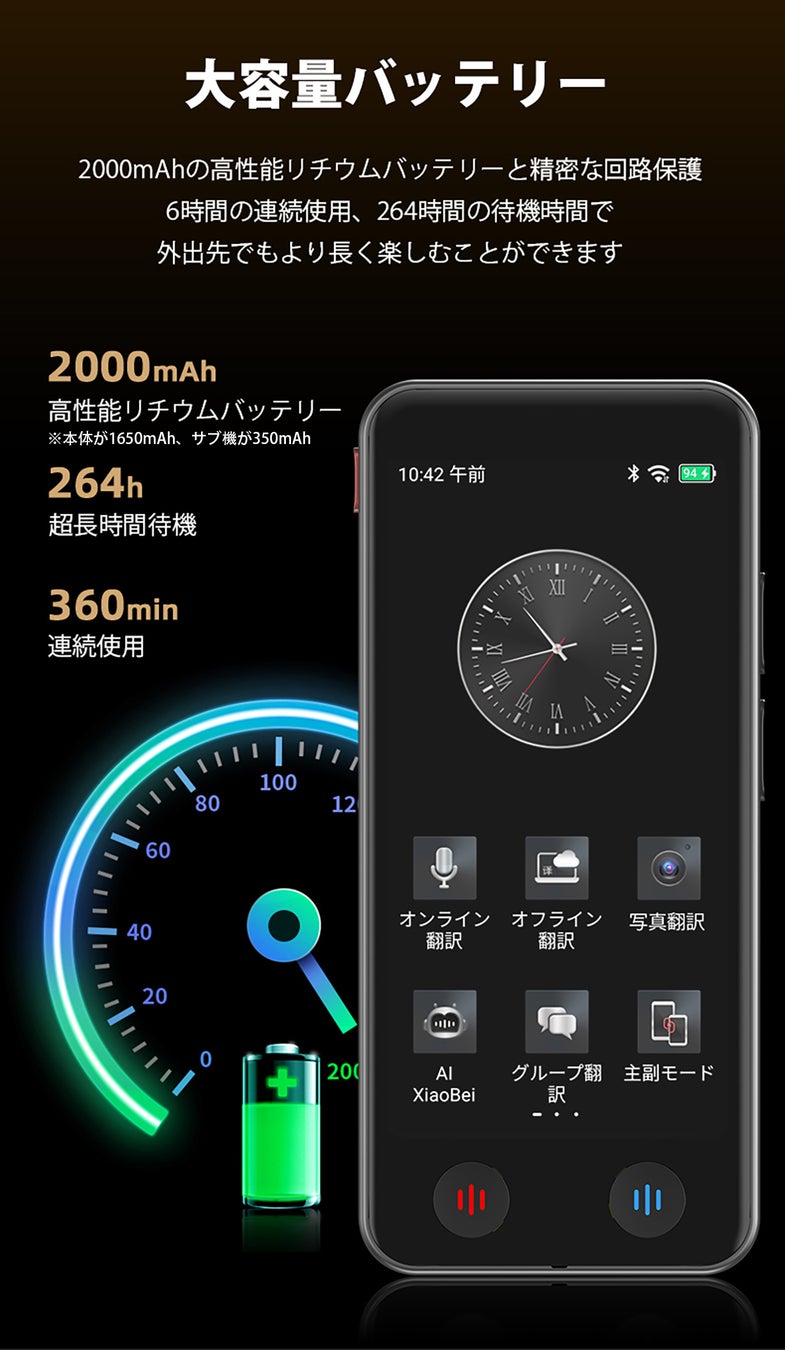 VORMORデュアルスクリーン翻訳機でバッテリーの心配も無用。1回の充電で360分の翻訳が可能で、264時間の待機時間でフルワークウィークも対応します。ベルリンのビジネスミーティングから北京のカジュアルな会話まで、スムーズな接続が保証されます。