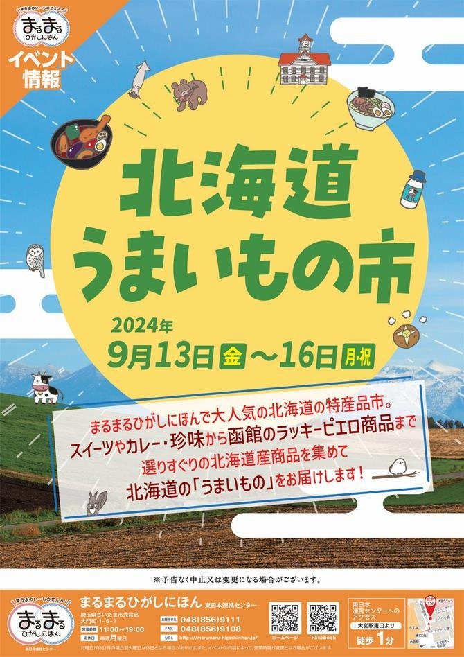 東⽇本の「ヒト・モノ・情報」が⼤宮に集合!⼤宮駅東⼝から徒歩1分のところにある、交流・発信・活性化を促す地⽅創⽣の場「まるまるひがしにほん(東⽇本連携センター)」で「北海道うまいもの市」を開催します!