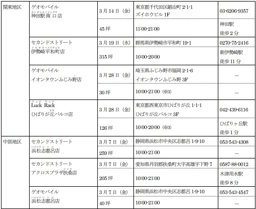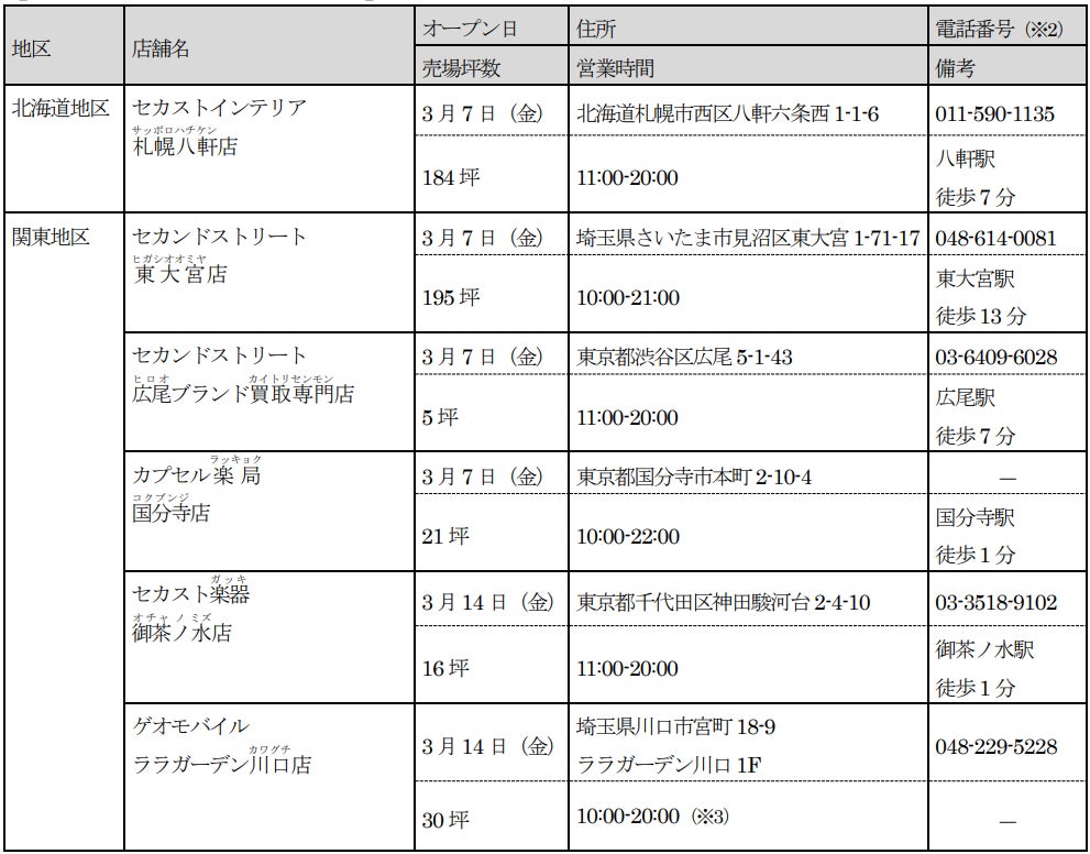 新たに、「セカンドストリート」9店舗、「ゲオモバイル」6店舗、「ラックラック」1店舗、「カプセル楽局」1店舗の合計17店舗が2025年3月度にオープンします。