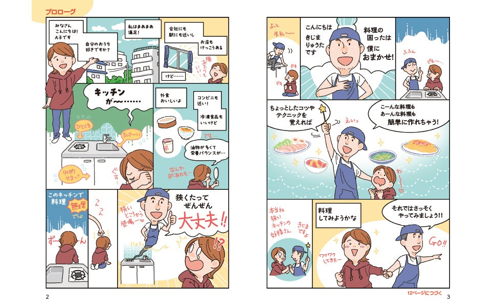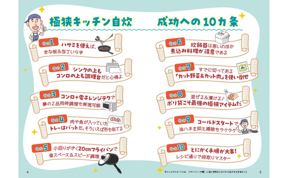 (マンガ)実録! 極狭キッチンで料理してみた/極狭キッチン攻略の極意/基本の装備を揃える/極狭キッチン収納テクニック/電化製品活用虎の巻/計量と火加減の取り扱い説明書