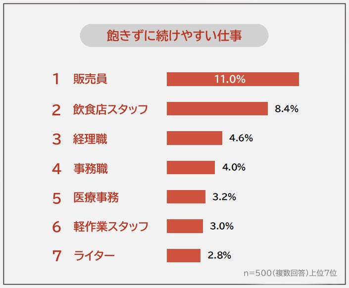 仕事をしている500人が実際に経験した「飽きずに続けやすい仕事」の1位は「販売員(11.0%)」でした。2位「飲食店スタッフ(8.4%)」、3位「経理職(4.6%)」、4位「事務職(4.0%)」が続きます。