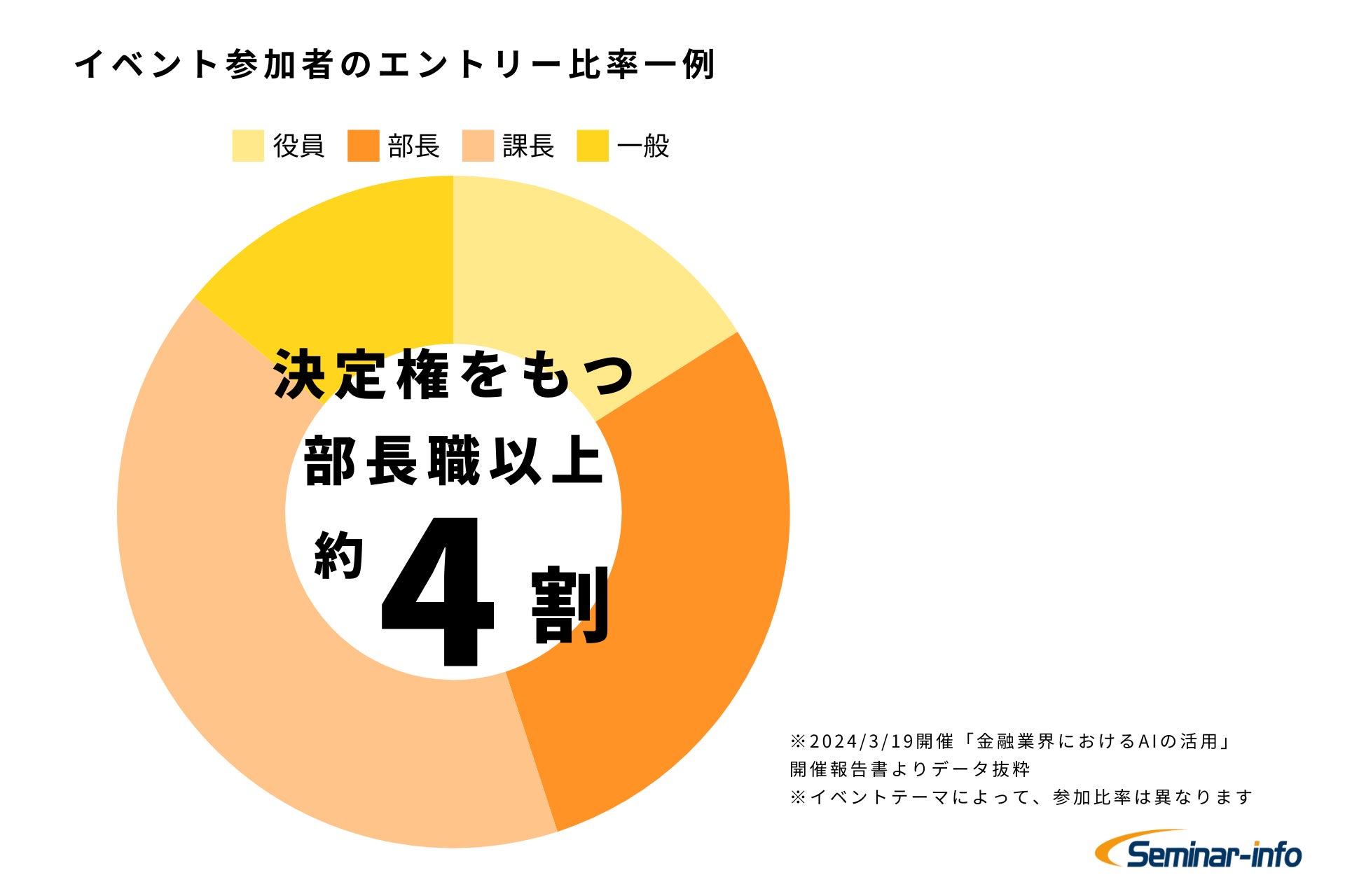 セミナーインフォ主催の協賛イベントは、集客する対象や開催テーマをイベントごとに設定しております。そのため、自社に適した集客対象/テーマのイベントに出展することで、自社のプロモーションに適したリードを獲得できます。