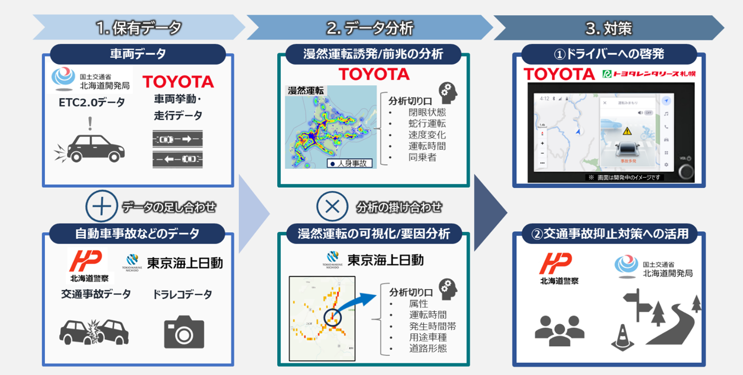 これまでTMFでは、沖縄(沖縄ゆいまーるプロジェクト)、京都(京都 はんなり 和(なごみ)のみちプロジェクト)において警察と連携した取り組みを進めてきました。今回、北海道において、道警が保有する交通事故データに加え、国土交通省北海道開発局が持つ道路関連データのほか、トヨタの車両データ、東京海上日動の保険データなど官民それぞれが保有するデータを活用しながら分析や対策を講じることで、北海道における交通事故削減を目指していきます。また、生物多様性にも配慮しながら、各者が協働していきます。