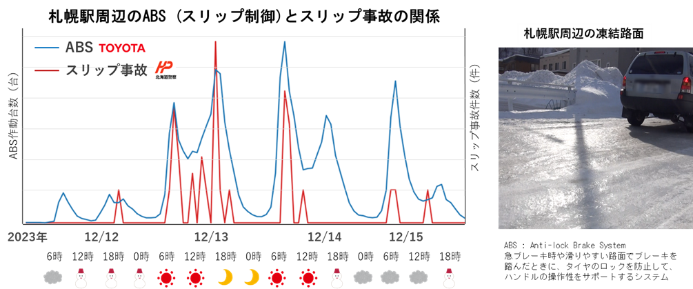 雪道によるスリップ事故対策として、交通事故データ(道警)、車両データ(トヨタ)の分析を進め、相関を確認しています(下図参照)。さらに保険データ(東京海上日動)の深堀をして、その要因等の分析を進めます。