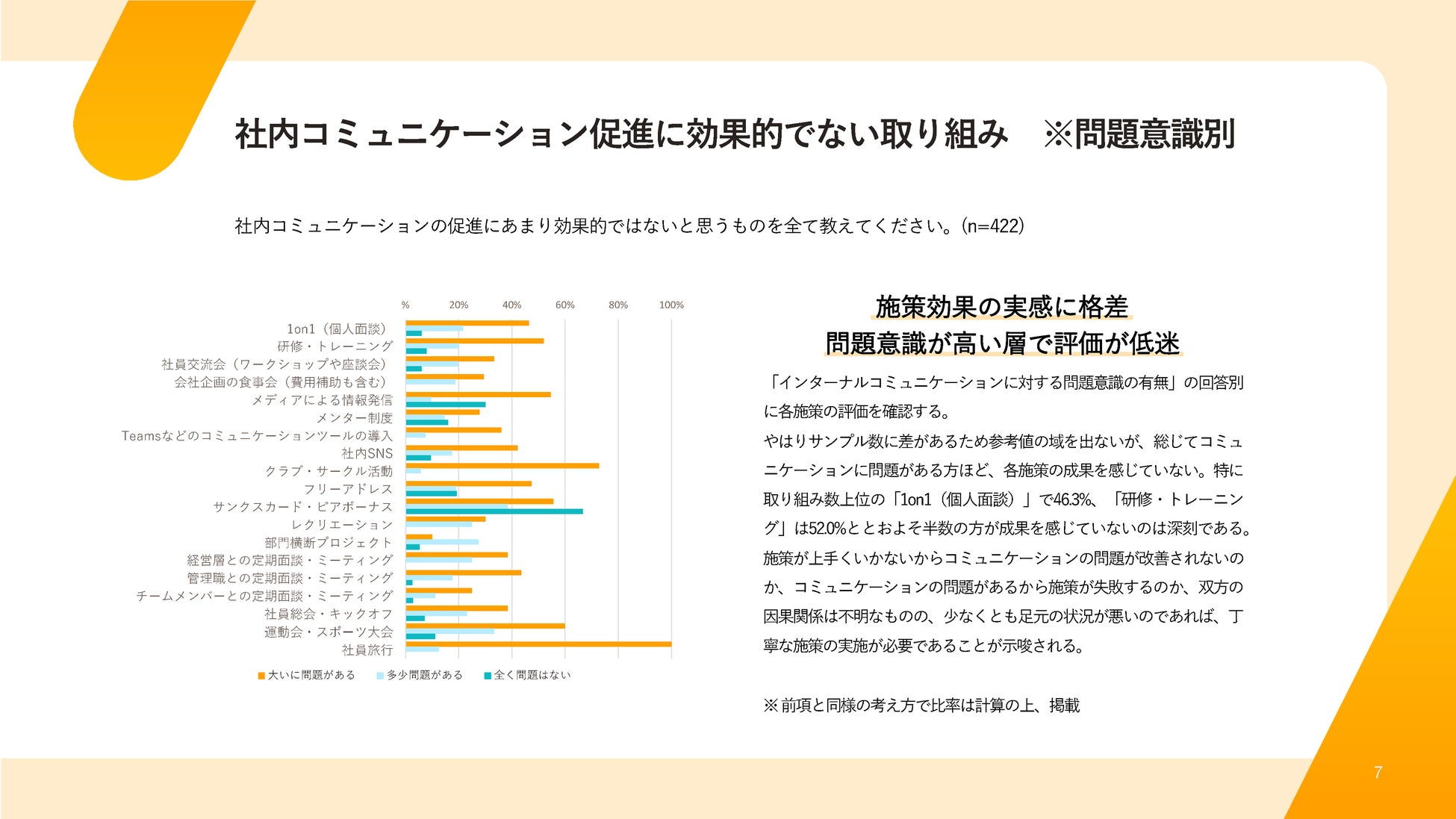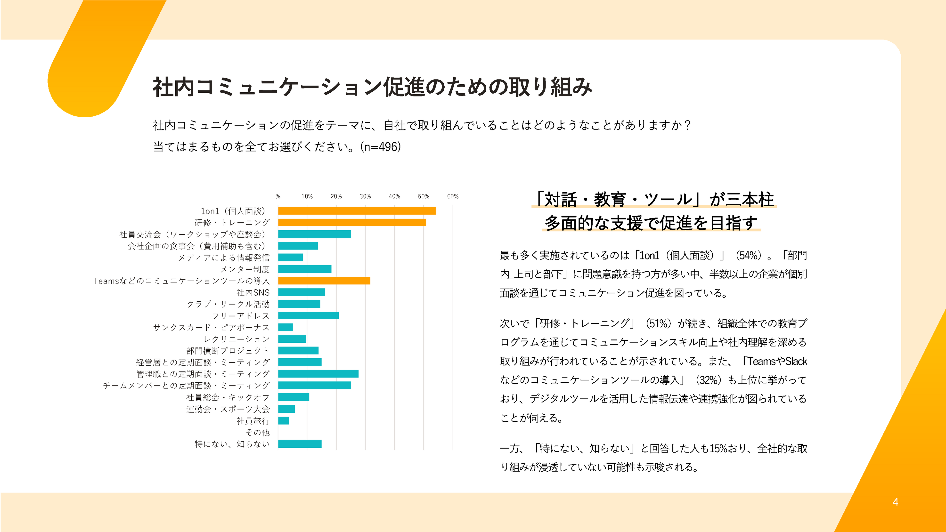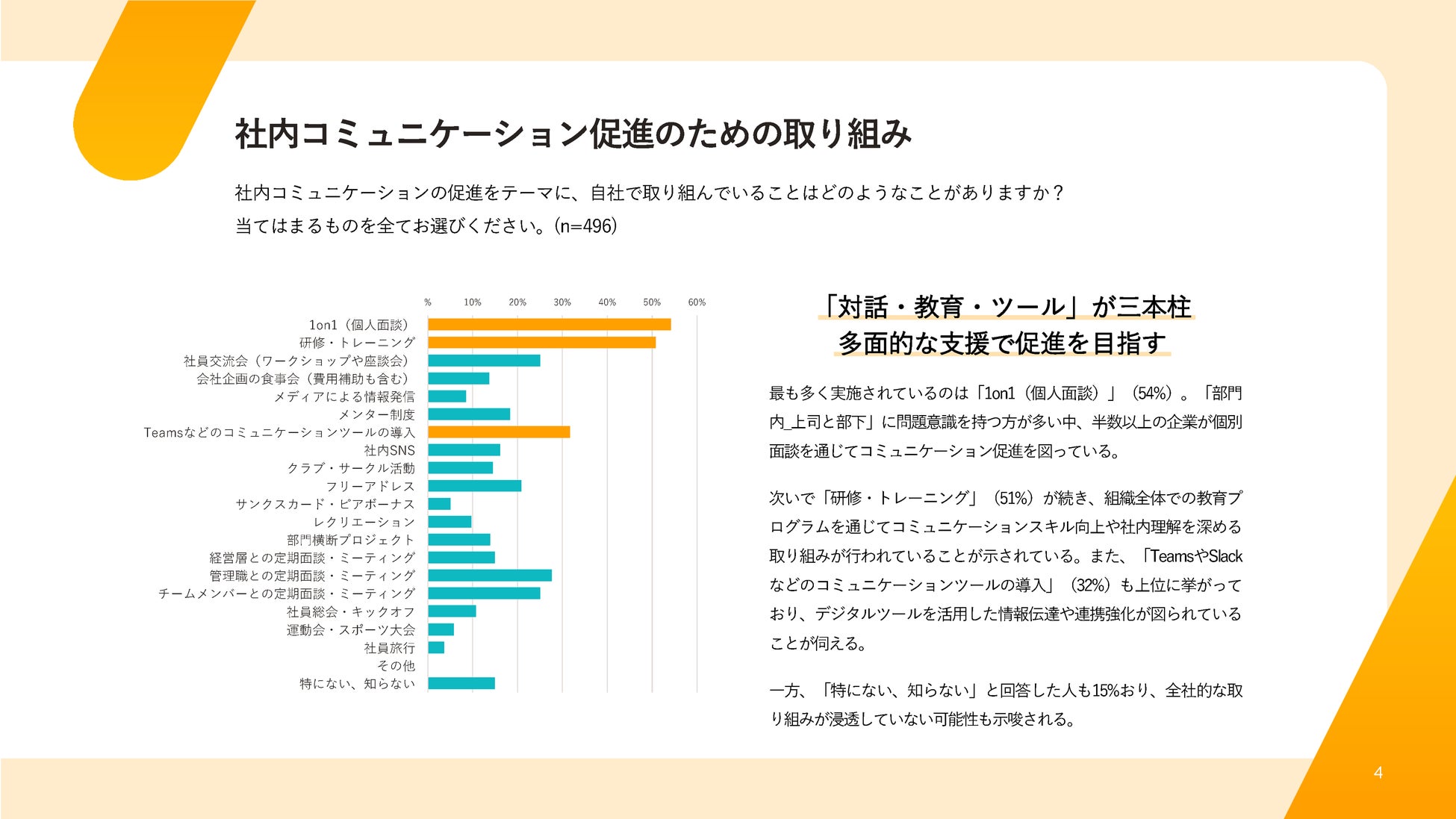 このサービスは、当社が独自に行ったインターナルコミュニケーションサーベイを通じて浮き彫りになった職場の課題や組織内のズレを解消します。詳細はこちらにてご確認ください。