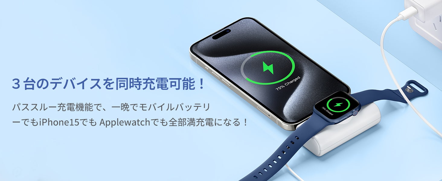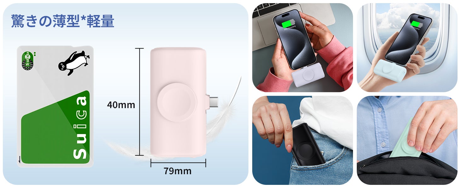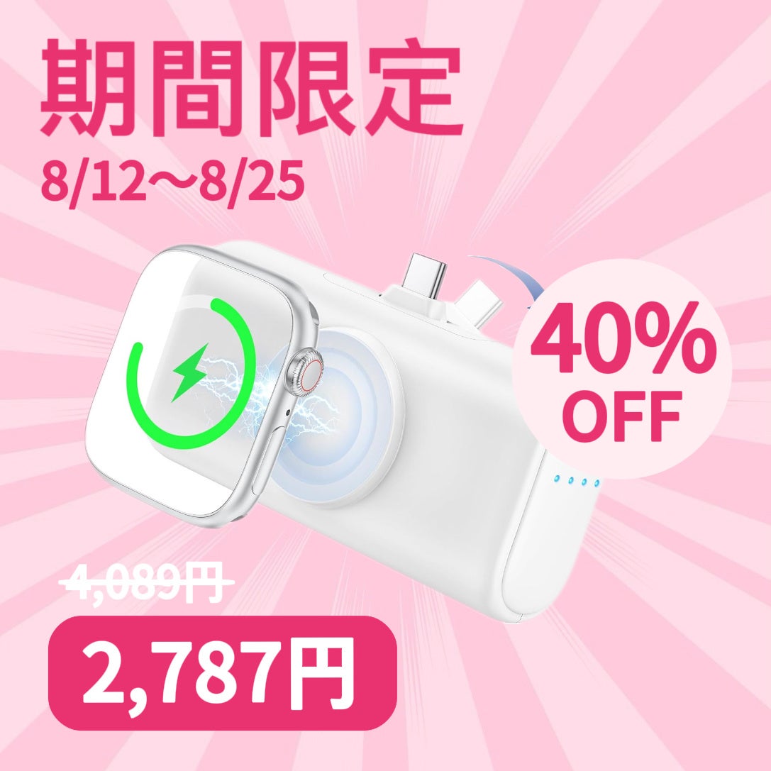 【40%OFFセール】102g超軽量!ケーブル不要のTYPE-C一体型モバイルバッテリー、iPhone&Apple Watch同時充電対応