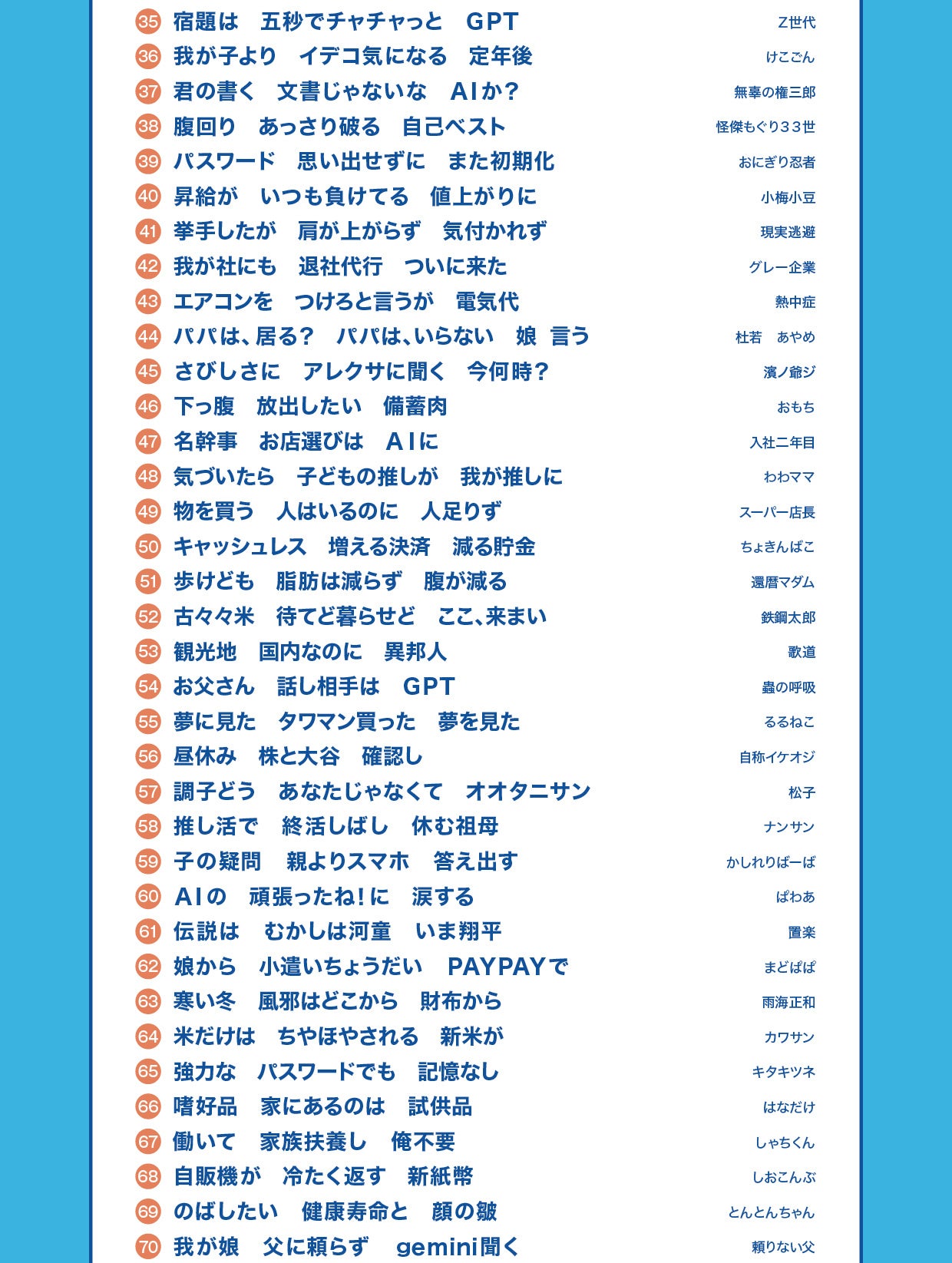 今回は、物価高、AI、快進撃を続ける大谷選手など前年と同様の句のほか、古古古米や2025年ならではの語句で日常を詠んだ作品が優秀100句に輝きました。