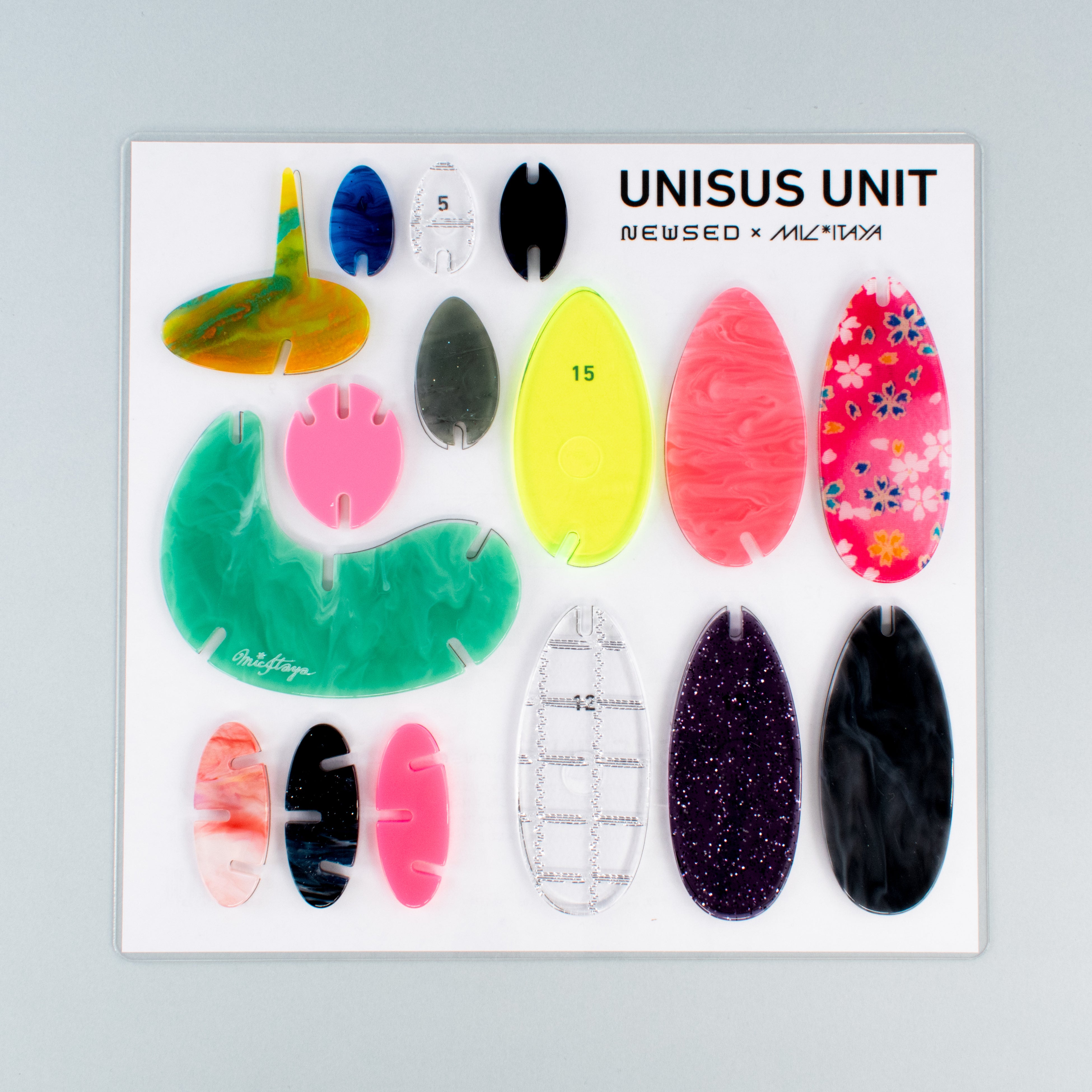アクセサリーパーツや店舗用什器などを手がける工場から出る、装飾アクリルの端材からできています。